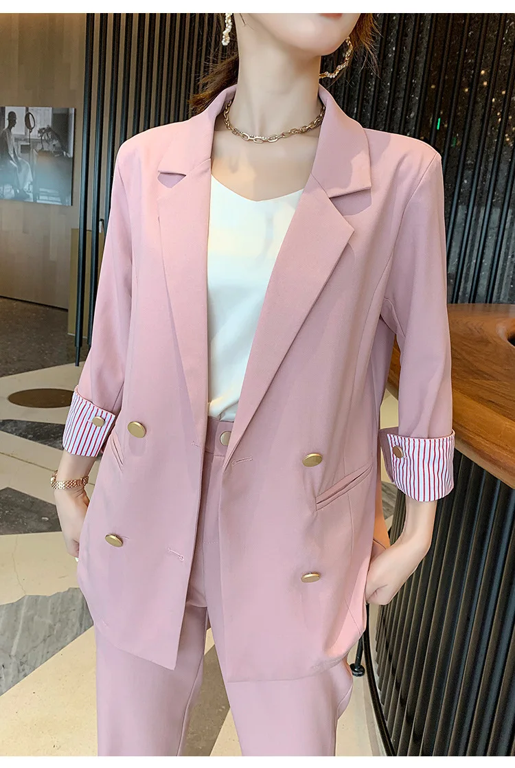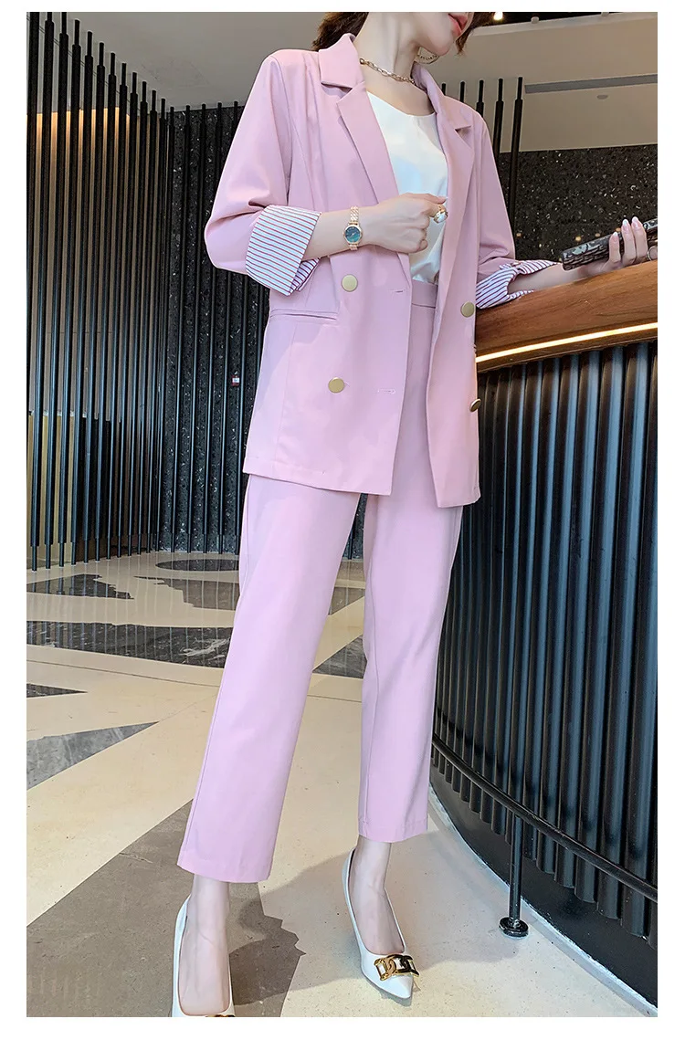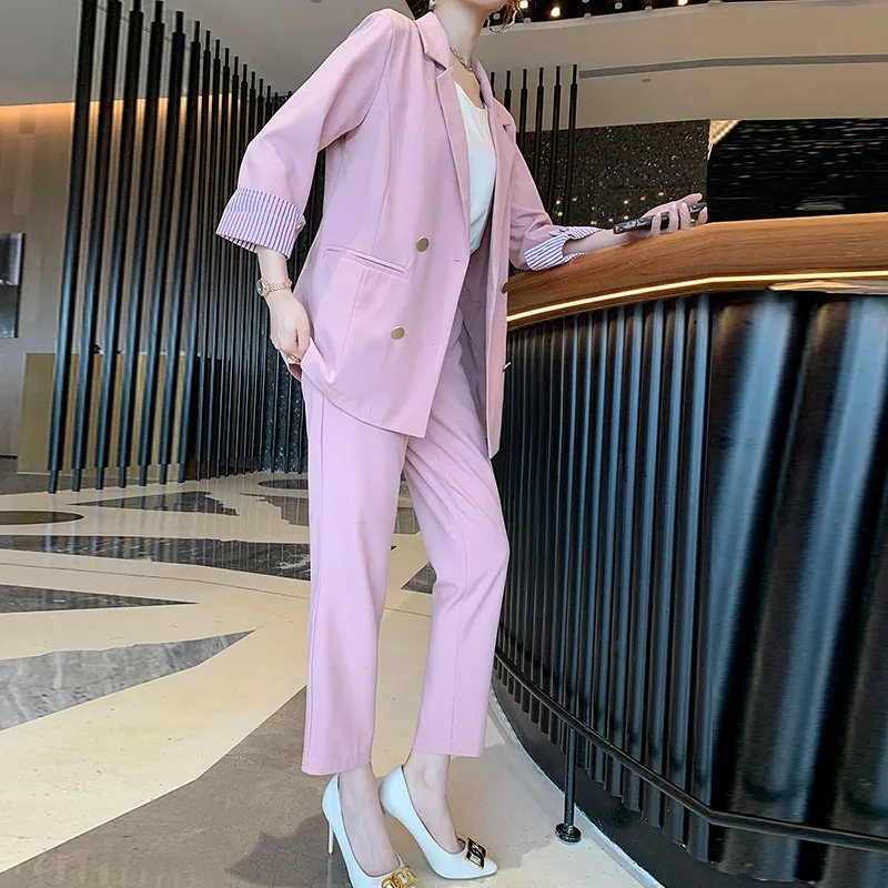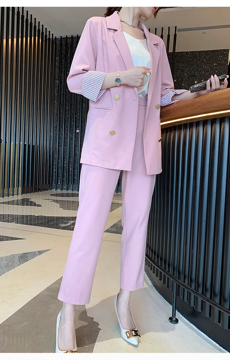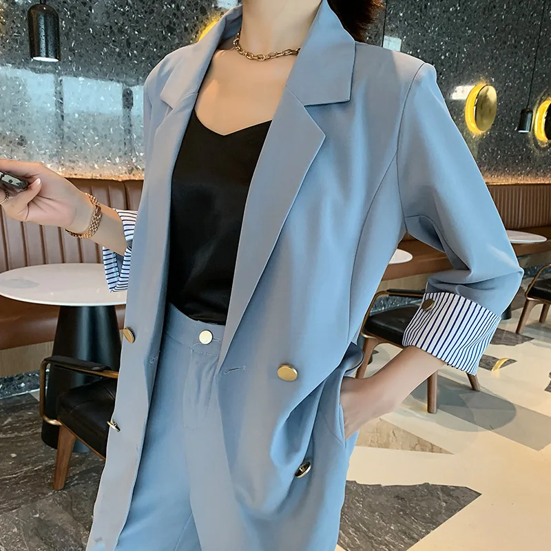 Винтажный двубортный женский брючный костюм, пиджак с отложным воротником и брюки с высокой талией, офисная одежда на лето 2019, женский костюм