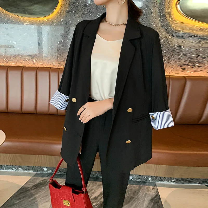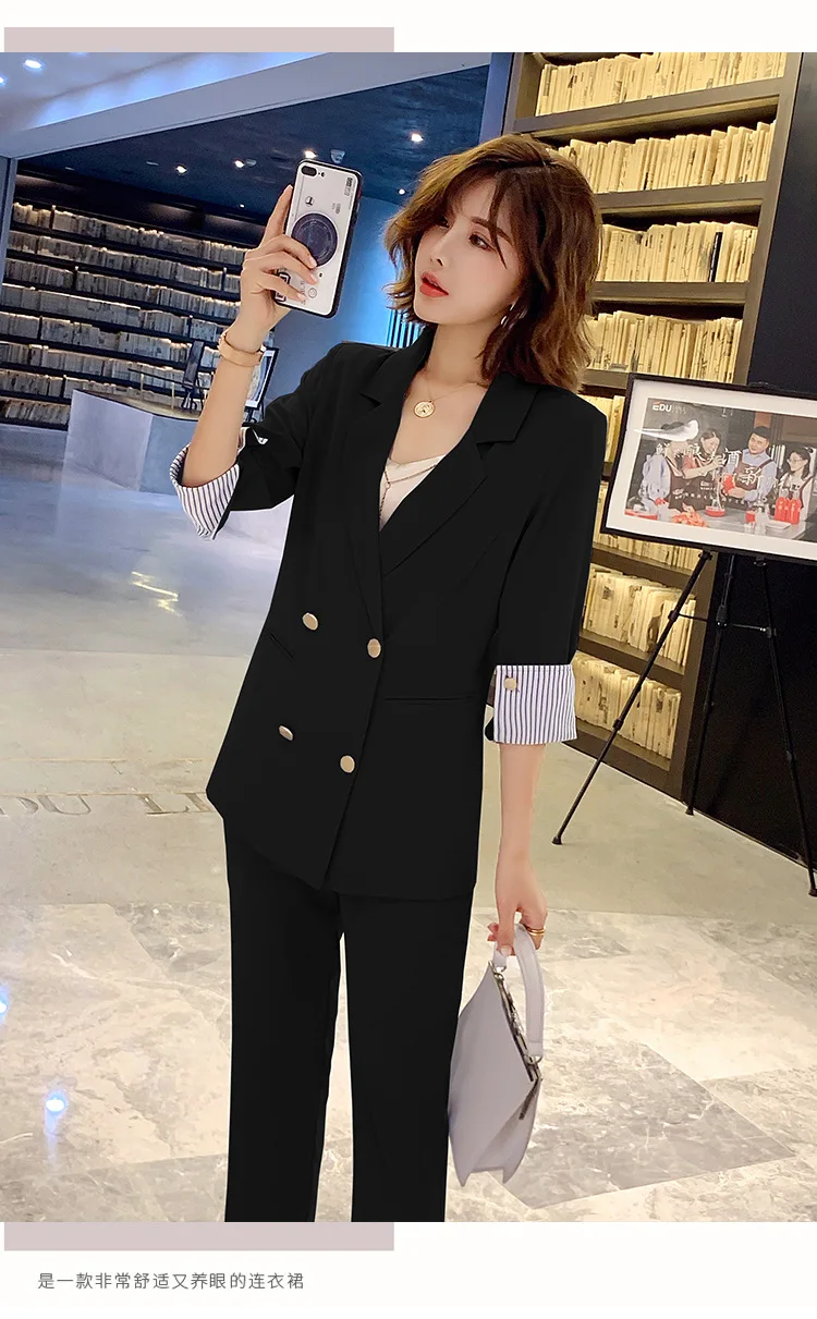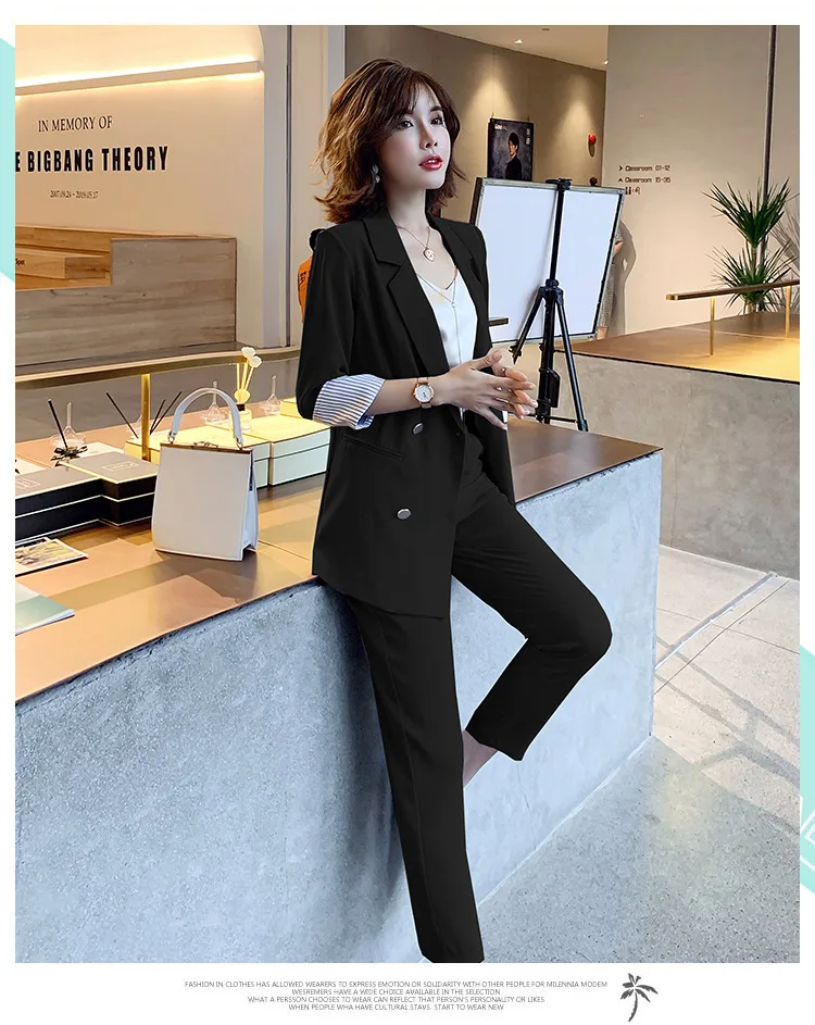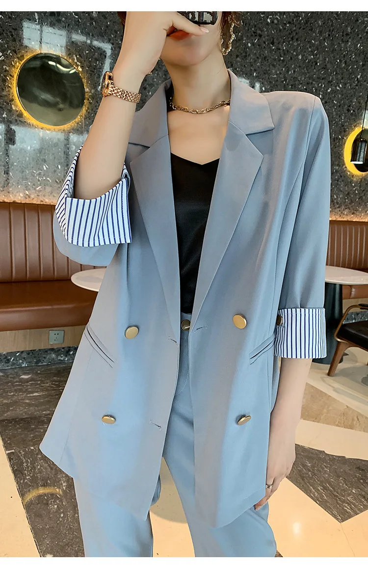Винтажный двубортный женский брючный костюм, пиджак с отложным воротником и брюки с высокой талией, офисная одежда на лето 2019, женский костюм