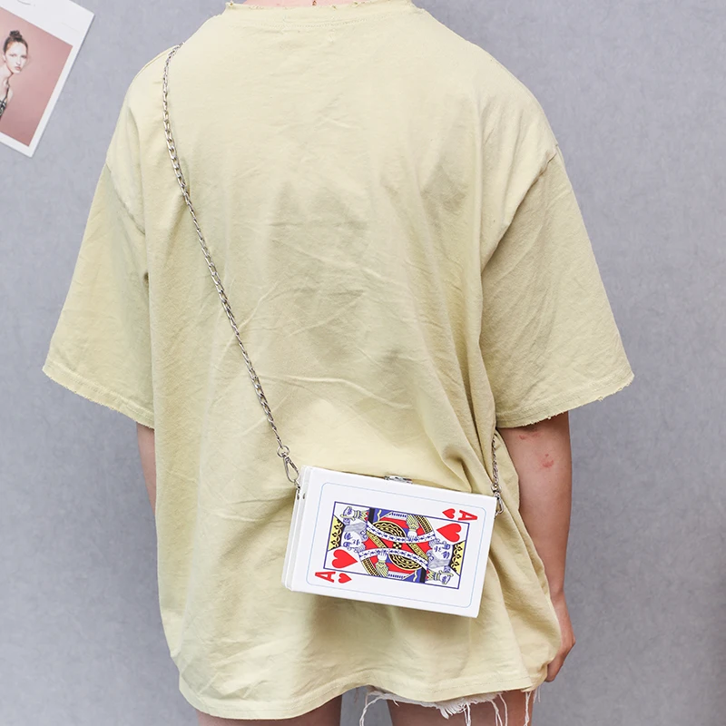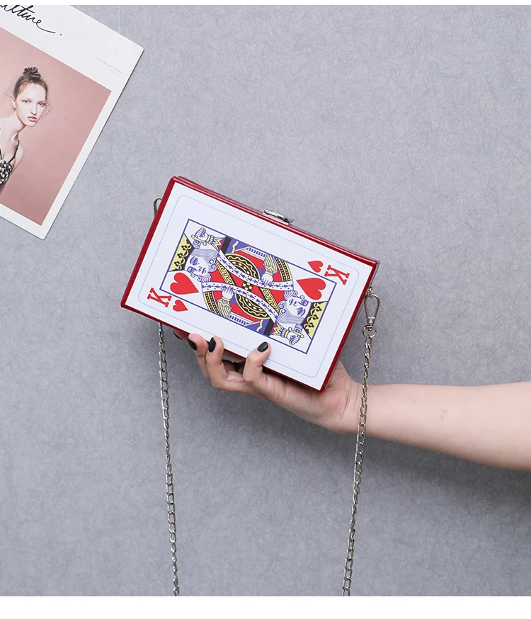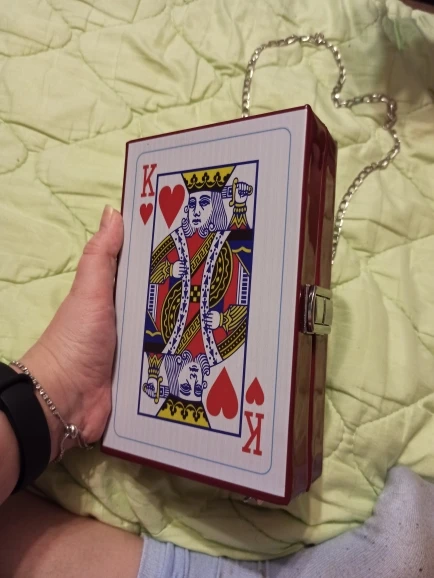 Сумка очень милая. Я хотел бы выбрать вариант «король», так как это то, что соответствует лицевой карточке в колоде. Сумочка маленькая, но милая. Таким образом, вы можете поместить небольшой кошелек, телефон и ключи в сумку-но не много другого. В целом это идеальный кошелек для свиданий.