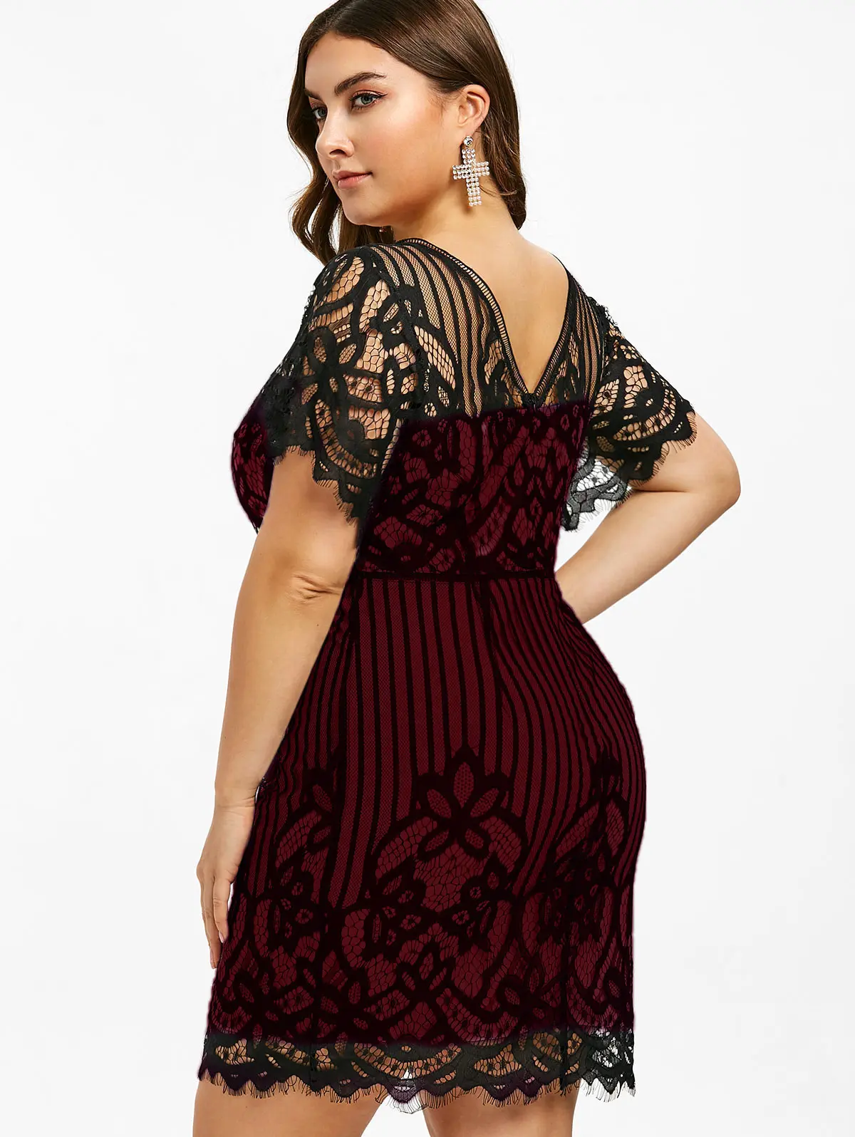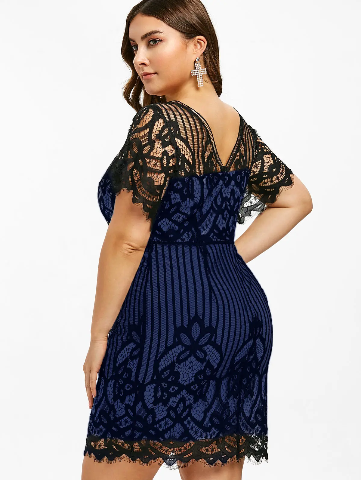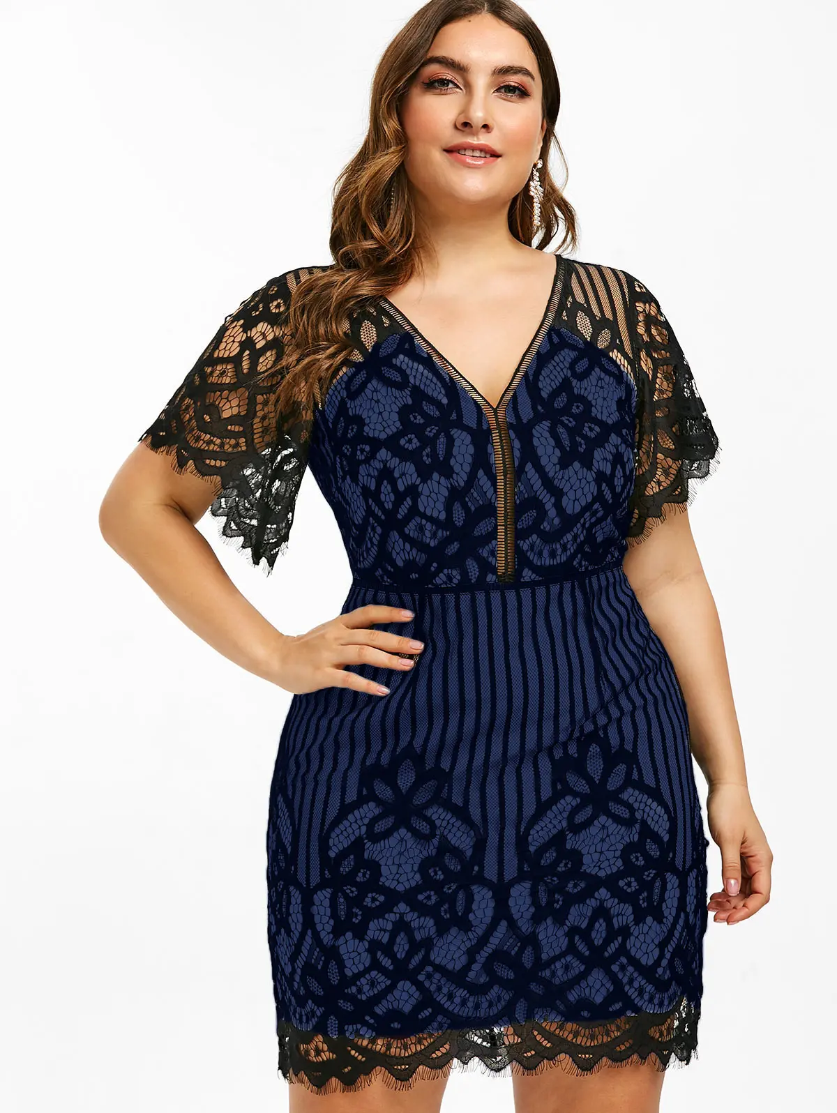 Кружевное мини-платье большого размера плюс, облегающее летнее платье в полоску с коротким рукавом и v-образным вырезом, женские вечерние платья с высокой талией