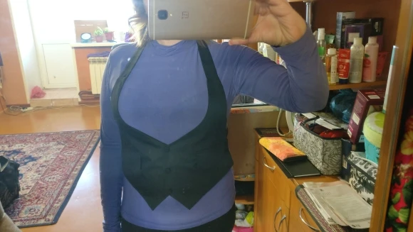 Желетка хорошая,даже для пышных форм,одела под белую блузку,получилось «хипово»,подойдет под любую однотонную футболку,очень довольна!
