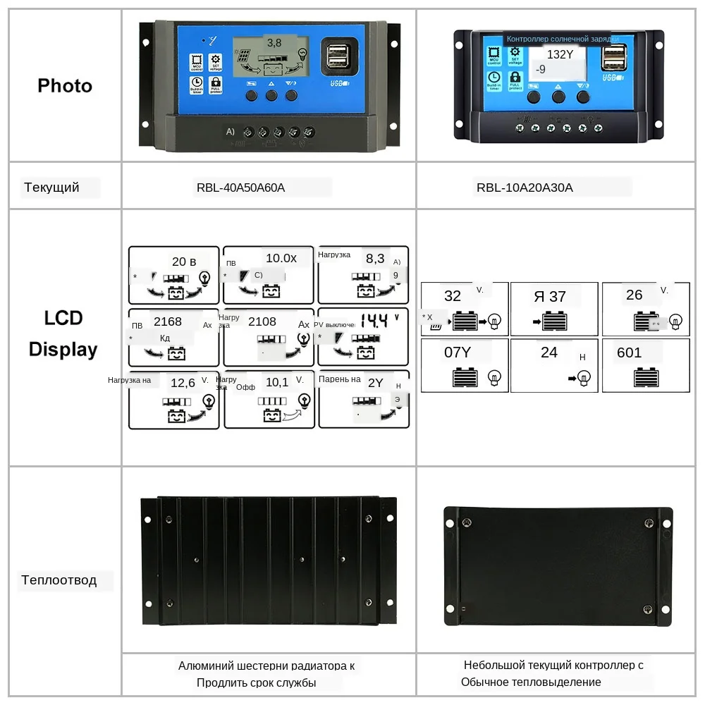 Контроллер солнечного зарядного устройства 60A 50A 40A 30A 20A 10A 12V 24V зарядное устройство LCD Dual USB регулятор солнечной панели для макс. 50V PV вход