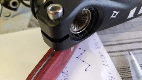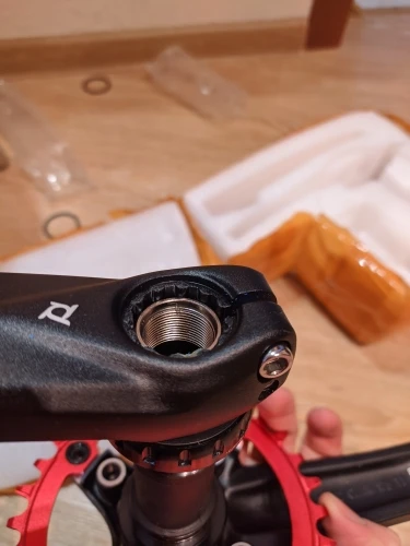 Отзыв для тех, кто собрался покупать. Плюсы: сделано аккуратно, выглядит хорошо. Минусы: ось короче необходимой длины, хотя по размерам соответствует описанию. Для такого шатуна нужна более длинная ось, либо менее толстое посадочное место шатуна. Левый шатун садится не полностью, не хватает около 3 мм. Выход: проставочное кольцо с левой стороны каретки не устанавливать, упор внутренней втулки каретки обрезать с любой из сторон, чтобы она села глубже. В этом случае левый шатун будет ближе к раме в сравнении с правым, но зато он встанет на свое посадочное место полностью и затянется как следует