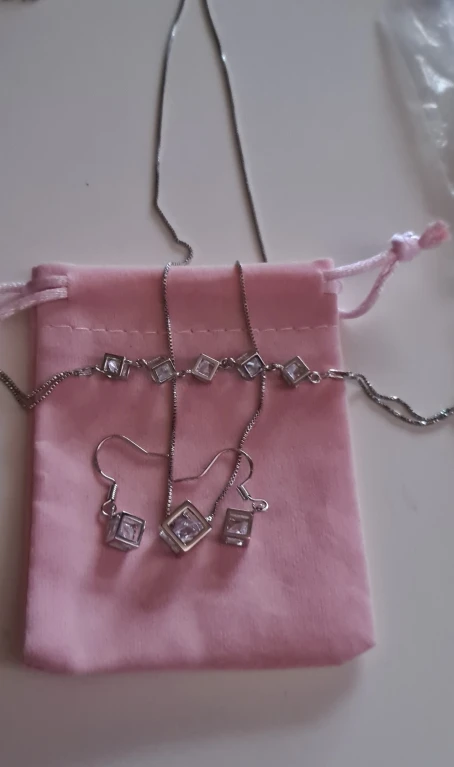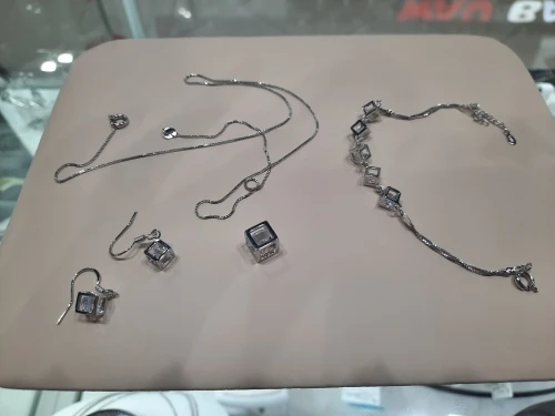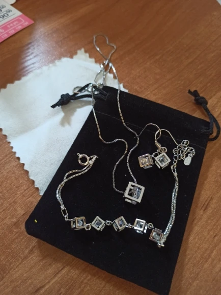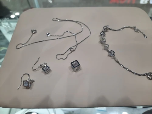 очень аккуратный, кубики на сережках просятся размером побольше, а то они размером с кубиками на браслете; на браслете 4 кубика, тяжесть которых его постоянно разворачиват на внутреннюю часть кисти; приятно удивилась положенным жемчужным сережкам, мешочку для набора,