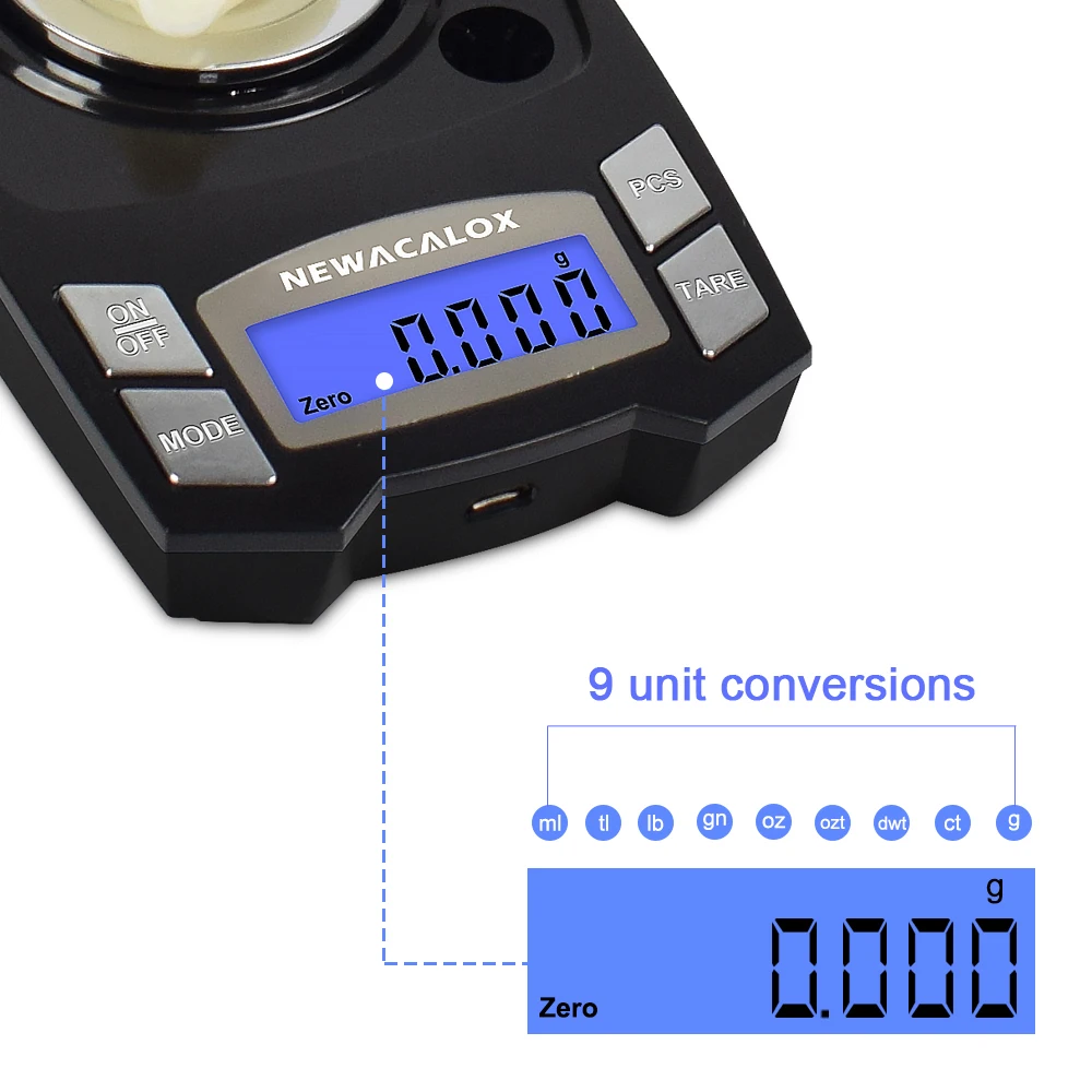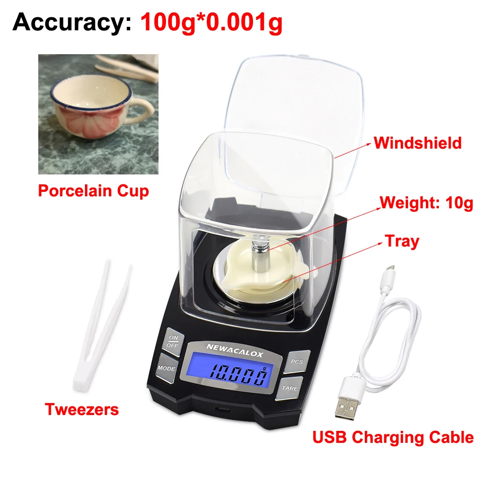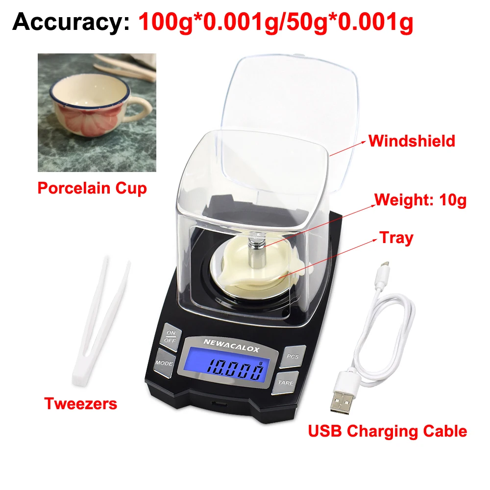 Цифровые электронные весы NEWACALOX, точные весы для ювелирных изделий и лабораторий с зарядкой от USB, 100 г50 г x 0,001 г