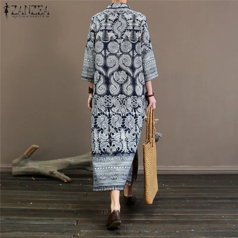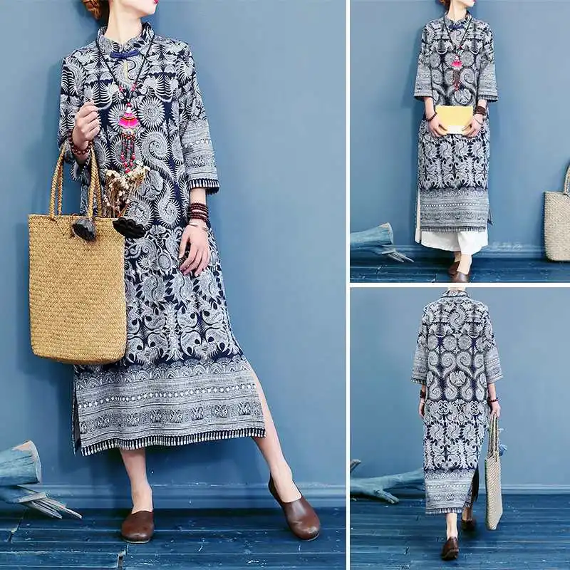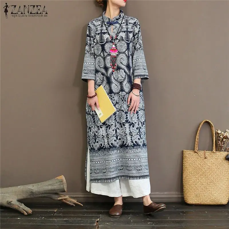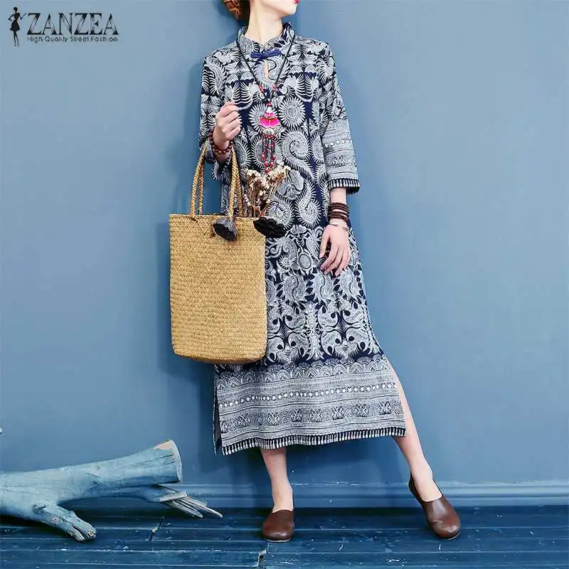 Платье ZANZEA женское с цветочным принтом, винтажный льняной сарафан в китайском стиле, с воротником-стоечкой, с рукавом 34, осень
