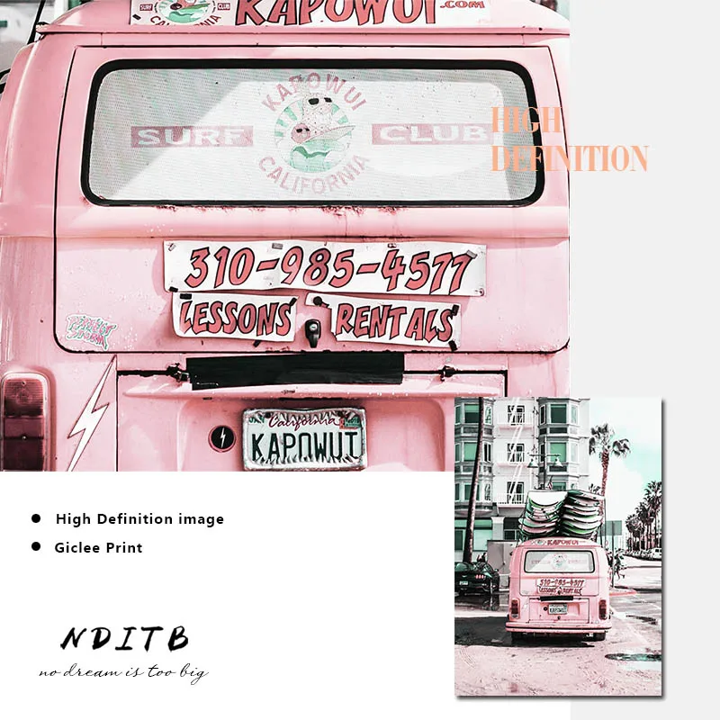 Песчаный пляж холст скандинавский стиль путешествия постер Скандинавская стена искусство Принт Розовый автобус морской пейзаж живопись Тропическое украшение картина