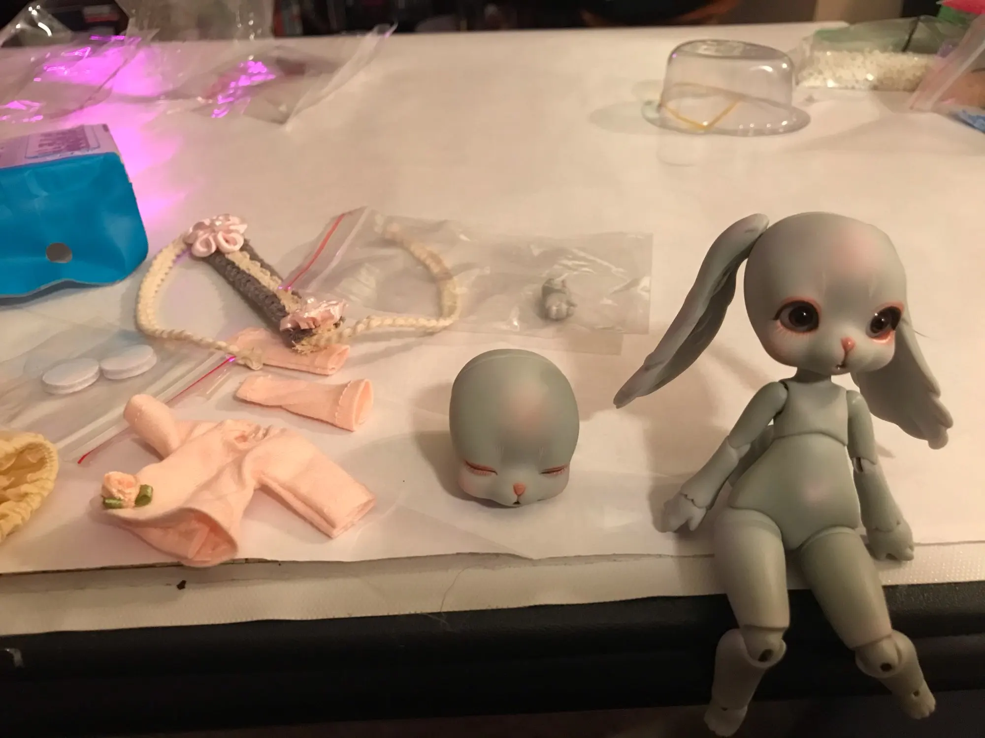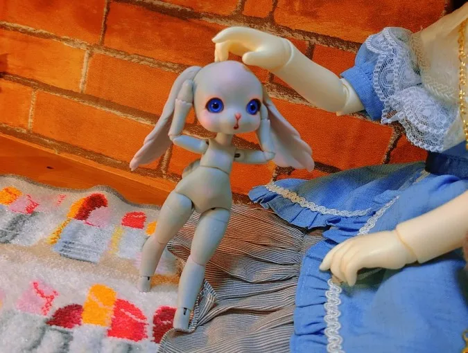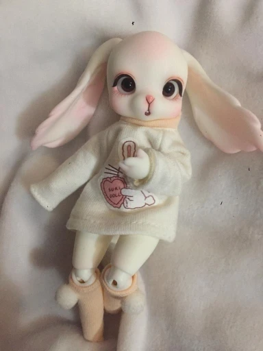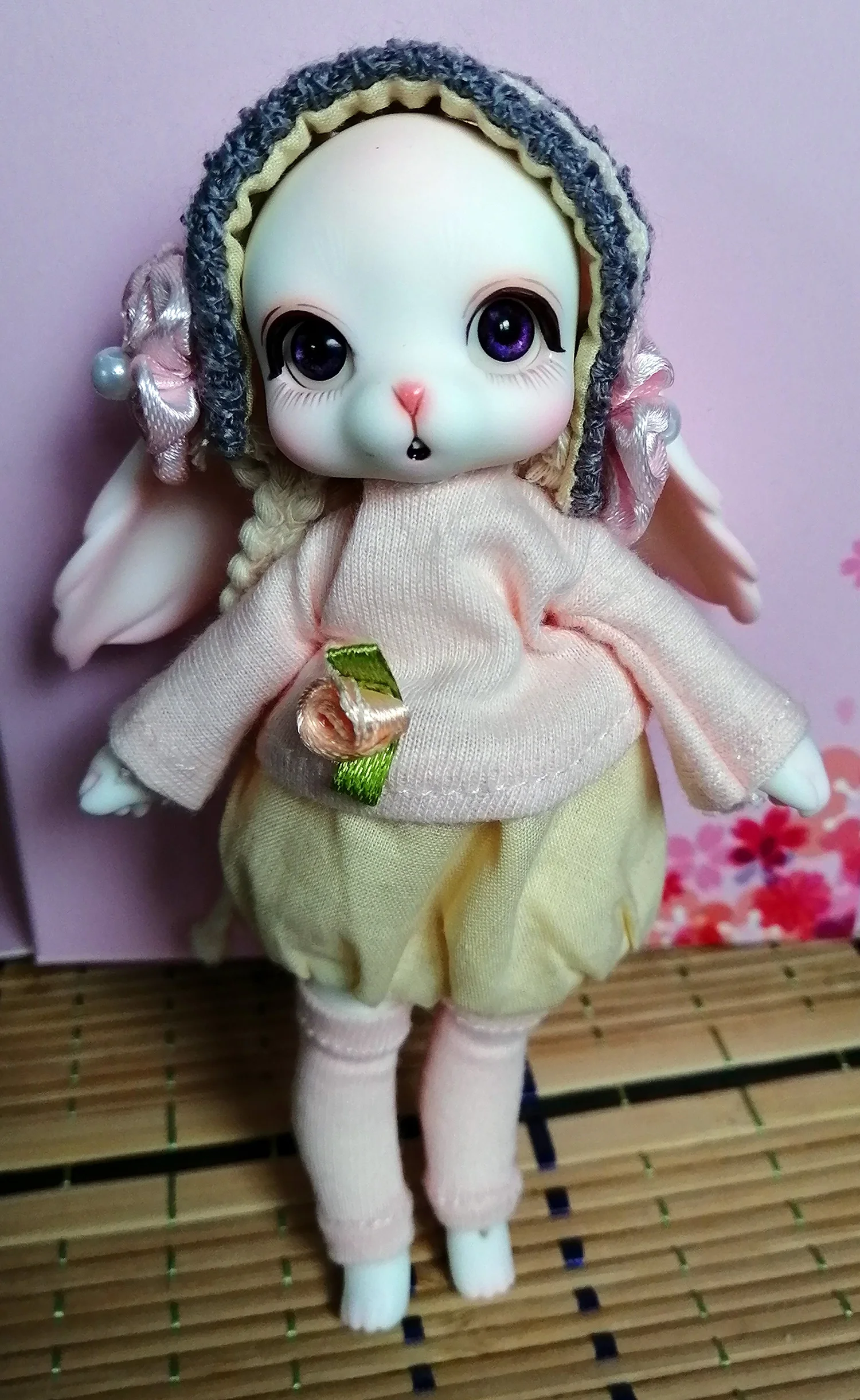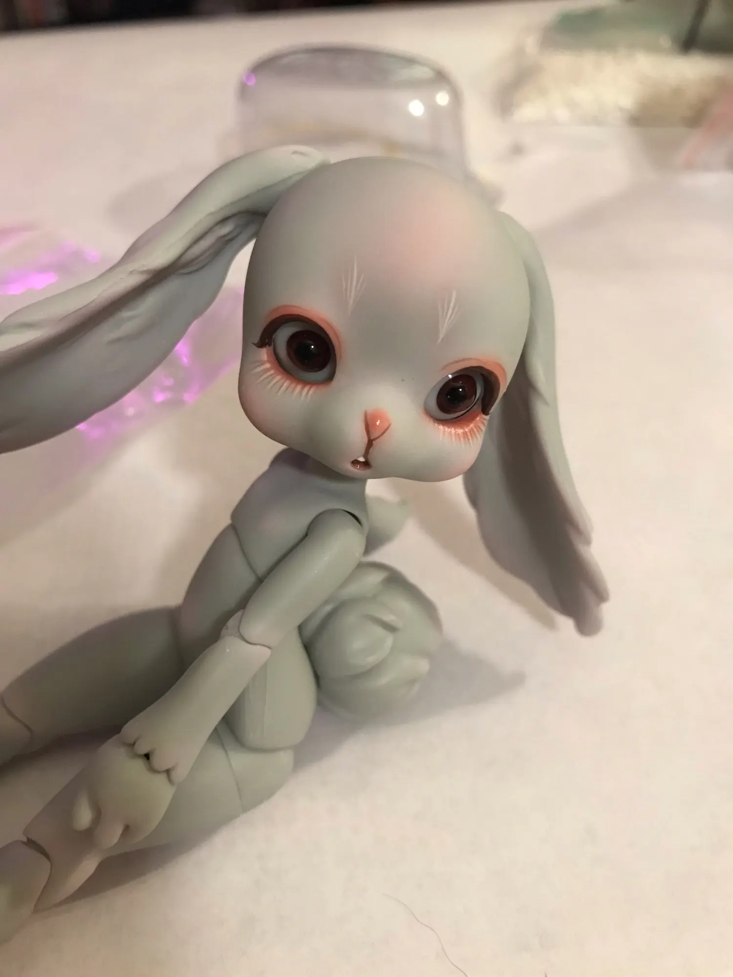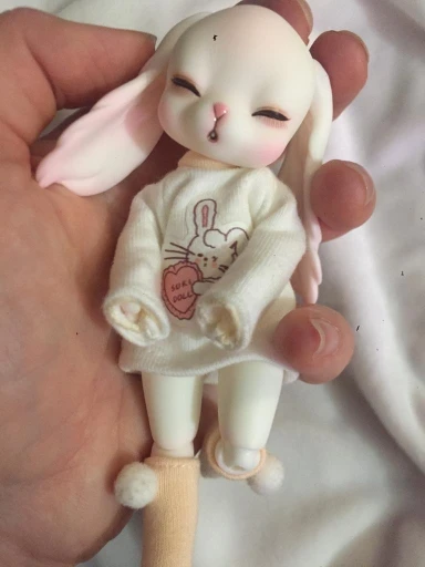 чудесный кролик, белоснежный, на ощупь приятный, макияж потрясный. В комплекте спящая готова, губка и дополнительные лапки. Карие глаза, как я и просила. Я более чем довольна! Большое спасибо за эту прелесть