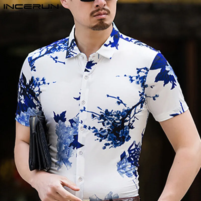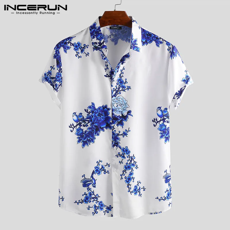 INCERUN Мужская рубашка в китайском стиле с цветочным принтом и отложным воротником для фитнеса с коротким рукавом, ретро топы для мужчин, Повседневная брендовая рубашка Camisa 2020
