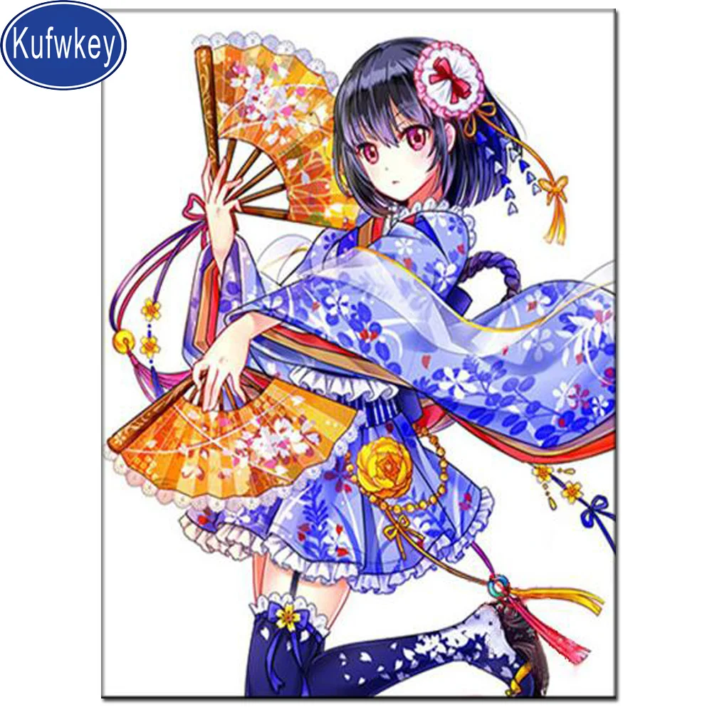 Мультфильм алмаз живопись "кимоно Аниме девушка" полный квадрат дрель Стразы картина, Алмазная мозаика полный дисплей вышивка алмаз,