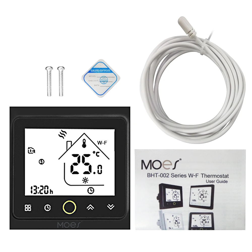 Вы хотите умный помощник, который поможет вам легко контролировать температуру? Мы можем предоставить вам много продуктов, которые могут быть применены не только для воды или электрического отопления, но и для водного/газового котла. Умный термостат MoesHouse станет вашим лучшим выбором контроля температуры для дома. Никогда не пропустите хороший товар! Особенности: Сенсорный экран с blacklight, легко читается. Можно управлять вашим телефоном, прежде чем вы вернетесь домой. С внутренним датчиком и датчиком пола, чувствительной температурой окружающей среды и температурой пола. Автоматическое получение температуры, влажности и PM2.5 региона для создания умной сцены. 0,5 °C точность держит температуру в рамках одного уровня вы установите. Совместимость с Alexa, Google Home. Не нужно использовать аккумулятор, память данных при выключении питания. Шесть циклов программирования обеспечивают максимальный комфорт и экономичность. Подходит для электрического отопления. Примечание: 1. Пожалуйста, внимательно прочитайте руководство пользователя. 2. Пожалуйста, убедитесь, что профессиональный человек устанавливает ваш термостат. 3. Убедитесь в том, что для того чтобы отрезать источника питания перед установкой. 4. После установки, пожалуйста, проверьте снова в соответствии с этой инструкцией, чтобы обеспечить безопасное использование. Технические характеристики: Цвет: черный/белый (по желанию) Тип: W-F/без W-F (опционально) Источник питания: 95 - 240 В переменного тока, 50 - 60 Гц Текущая нагрузка: 16A Датчик: Внутренний датчик, напольный датчик Точность: ± 0,5 ℃ или ± 1 ℉ Комплект Temp. Диапазон: 5 - 35 ℃ Дисплей температуры. Диапазон: 5 - 99 ℃ Температура окружающей среды. : 0 - 45 ℃ Влажность окружающей среды: 5 - 95% RH (без конденсации) Температура хранения. : -5 ~ 45 ℃ Мощность Потребляемая мощность: <1,5 W Ошибка синхронизации: <1% Материал корпуса: поликарбонат + АБС (огнестойкий) Установочная коробка: 86*86 мм квадратная или европейская 60 мм круглая коробка Класс защиты: IP20 Кнопки: емкостные сенсорные кнопки Размер изделия: как на картинке Вес изделия: 160 г/5,66 унций Посылка Размеры: 110*98*60 мм/4,33*3,86 * 2.36in Вес посылка: 263 г/9,27 унций Посылка список: 1 * термостат 1 * Руководство пользователя (на английском языке) 2 * винта