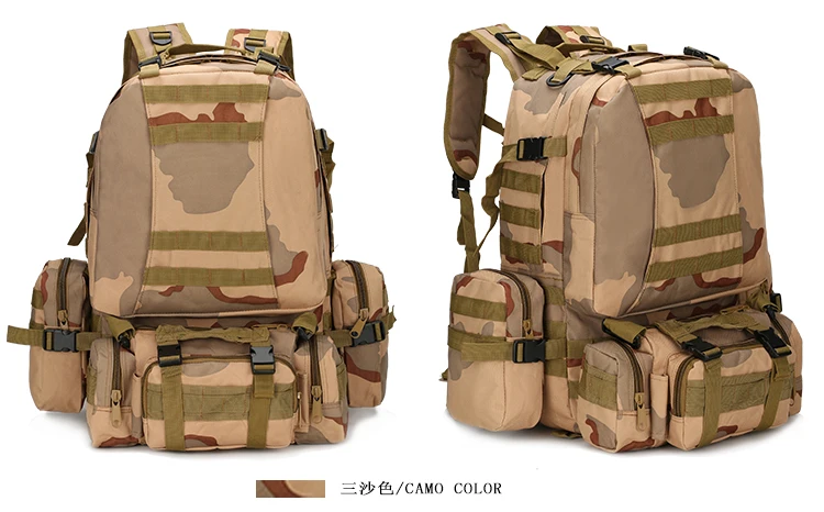 * 55 л большой емкости, с 3 съемными Молле мешками, прикрепленными спереди и с двух сторон.