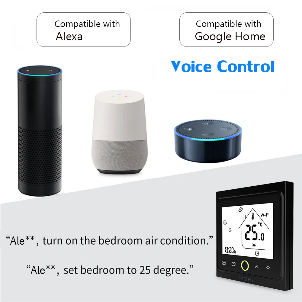 Вы хотите умный помощник, который поможет вам легко контролировать температуру? Мы можем предоставить вам много продуктов, которые могут быть применены не только для воды или электрического отопления, но и для водного/газового котла. Умный термостат MoesHouse станет вашим лучшим выбором контроля температуры для дома. Никогда не пропустите хороший товар!Особенности:Сенсорный экран с blacklight, легко читается.Можно управлять вашим телефоном, прежде чем вы вернетесь домой.С внутренним датчиком, чувствительной температурой окружающей среды.Автоматическое получение температуры, влажности и PM2.5 региона для создания умной сцены.0,5 °C точность держит температуру в рамках одного уровня вы установите.Совместимость с Alexa, Google Home.Не нужно использовать аккумулятор, память данных при выключении питания.Шесть циклов программирования обеспечивают максимальный комфорт и экономичность.Подходит для водного и газового котла.Примечание:1. Пожалуйста, внимательно прочитайте руководство пользователя.2. Пожалуйста, убедитесь, что профессиональный человек устанавливает ваш термостат.3. Обязательно отключите источник питания перед установкой.4. После установки, пожалуйста, проверьте снова в соответствии с этой инструкцией, чтобы обеспечить безопасное использование.Характеристики:Цвет: черный/белый (по желанию)Тип: WIFI/без WIFI (опционально)Источник питания: 95 - 240 В переменного тока, 50 - 60 ГцТекущая нагрузка: 5AДатчик: Внутренний датчикТочность: ± 0,5 ℃ или ± 1 ℉Установите температуру. Диапазон: 5 - 35 ℃Температура экрана. Диапазон: 5 - 99 ℃Температура окружающей среды. : 0 - 45 ℃Влажность окружающей среды: 5 - 95% RH (без конденсации)Температура хранения. : -5 ~ 45 ℃Мощность Потребляемая мощность: <1,5 WОшибка синхронизации: <1%Материал корпуса: поликарбонат + АБС (огнестойкий)Установочная коробка: 86*86 мм квадратная или европейская 60 мм круглая коробкаКласс защиты: IP20Кнопки: емкостные сенсорные кнопкиРазмер изделия: как на картинкеВес изделия: 153 г/5,39 унцийПосылка Размеры: 110*98*60 мм/4,33*3,86 * 2.36inВес посылка: 203 г/7,15 унцийПосылка:1 * термостат1 * Руководство пользователя (на английском языке)2 * Винт