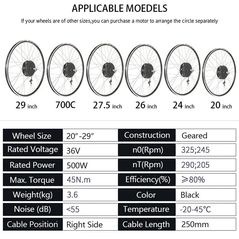 1) Это бесщеточный двигатель переднего колеса 36 в 500 Вт, он подходит для тормоза V и дискового тормоза.2) Максимальная скорость двигателя составит 25 км/ч (светодиодный или/40 км/ч (ЖК).(для соответствия стандартам ЕС и Северной Америки).3) Размер обода 20 "24" 26 "700C( 28"). Пожалуйста, заранее подтвердите размер вашего колеса. Если вам нужен другой размер, свяжитесь с нами.4) выбор цвета случайный5) Стандартная ширина установки/открытый размер переднего двигателя составляет 100-105 мм. Пожалуйста, подтвердите длину передней вилки.Если открытый размер вашей велосипедной вилки не составляет 100-105 мм. Возможно, этот комплект не подходит для вашего велосипеда.6) Если покупатель предпочитает для этого комплекта задний двигатель, пожалуйста, подтвердите длину задней вилки (оси) вашего велосипеда, будь она 135 мм, если да, свяжитесь с нами, мы можем изготовить для вас двигатель заднего колеса на заказ,