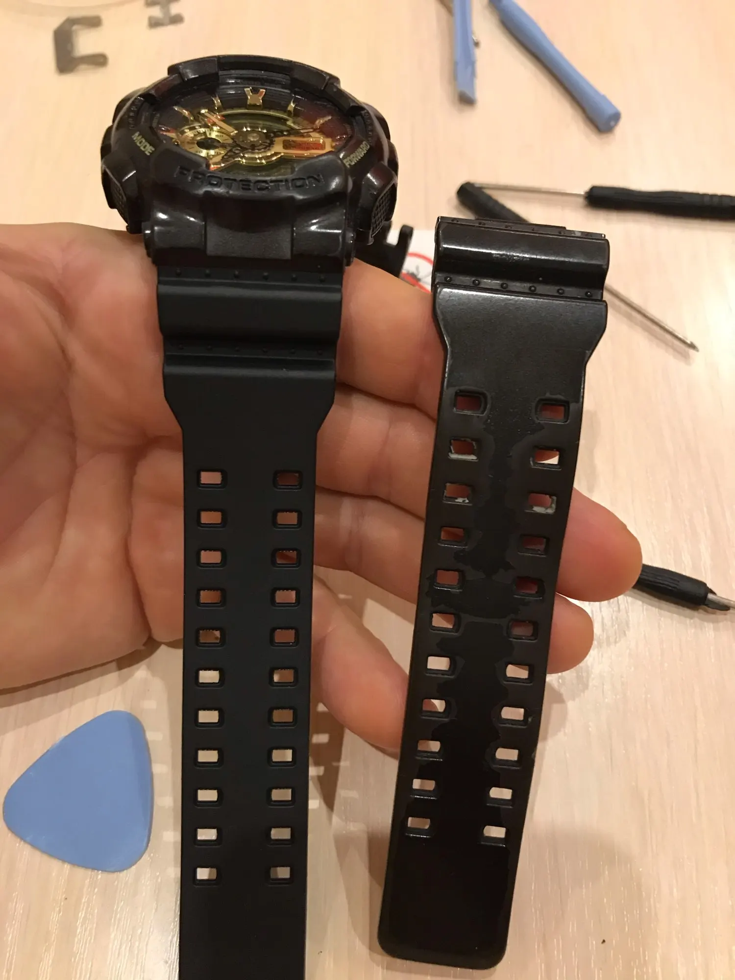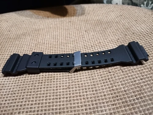 Не плохой ремешок тем более за такие деньги, а оригинал очень дорогой. Шпильки в комплекте слишком тонкие для ремешка, купил под оригинал. Сам ремешок по материалу тоже не плохой. Железки с надписью g-shock поставил от оригинала тк в комплекте не очень.