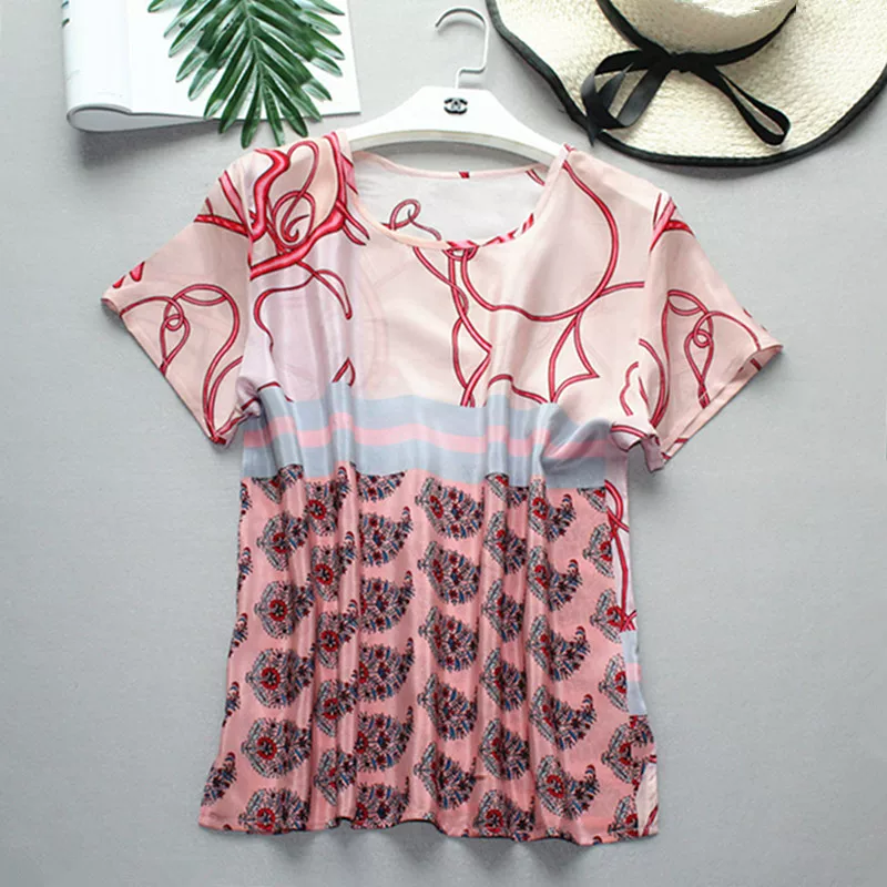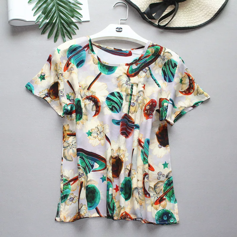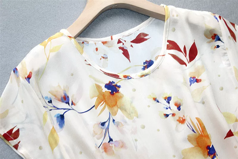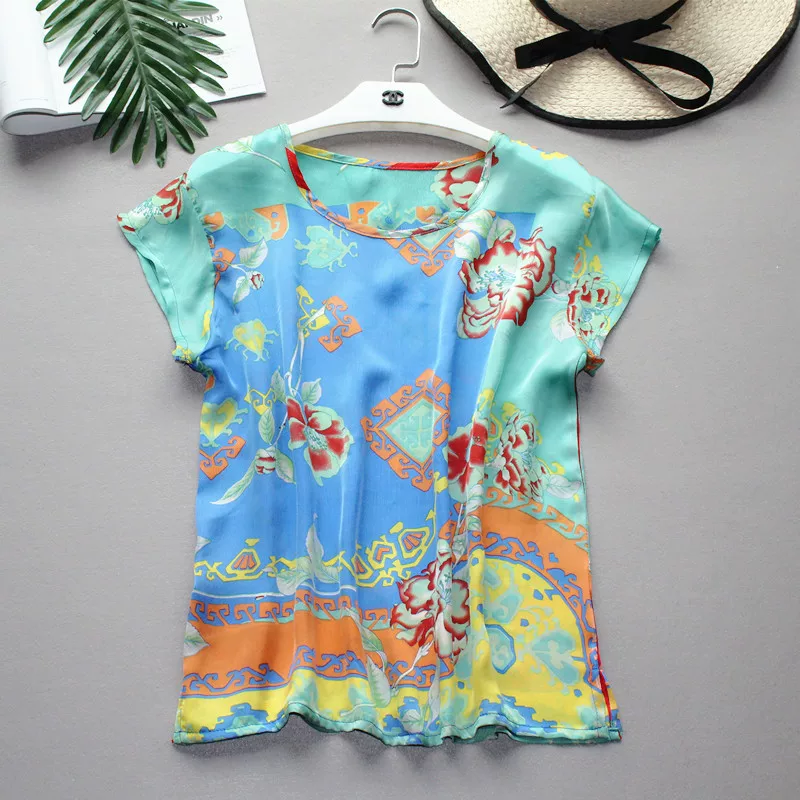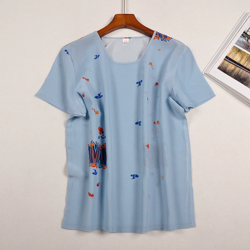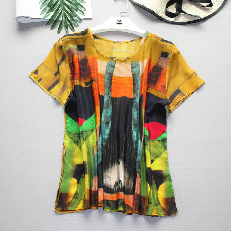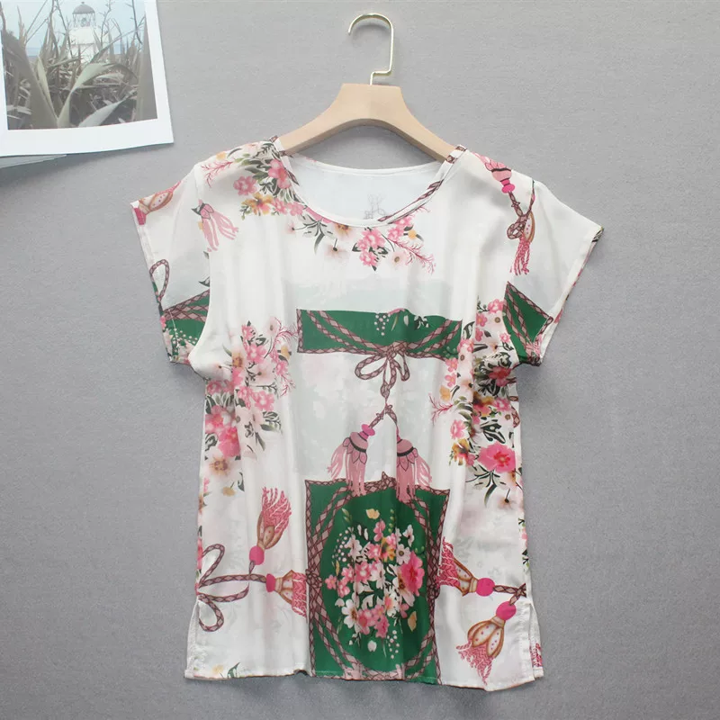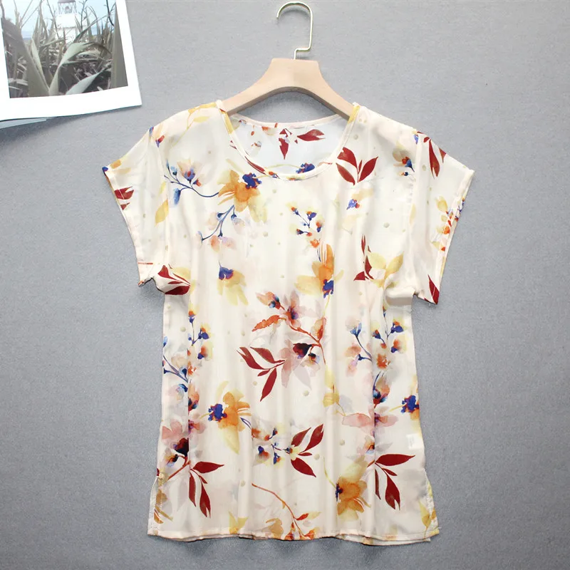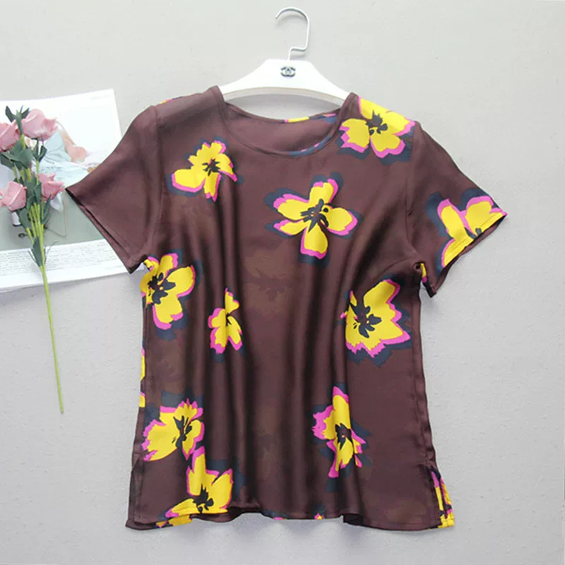 2021 Лето Новое поступление женский 100% шелк с коротким футболки с рукавами Круглый воротник шелковой футболкой со свободным низом-рубашка