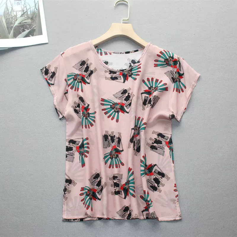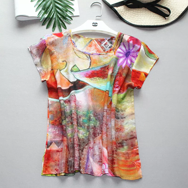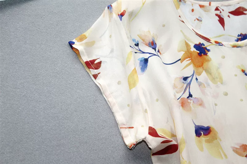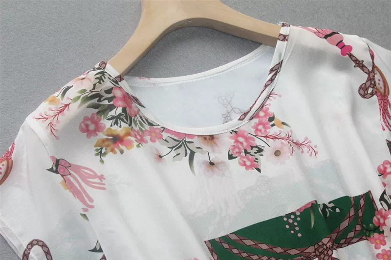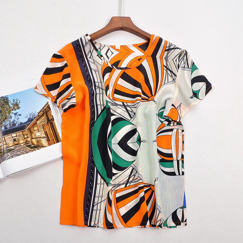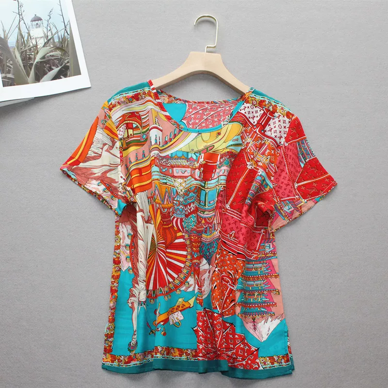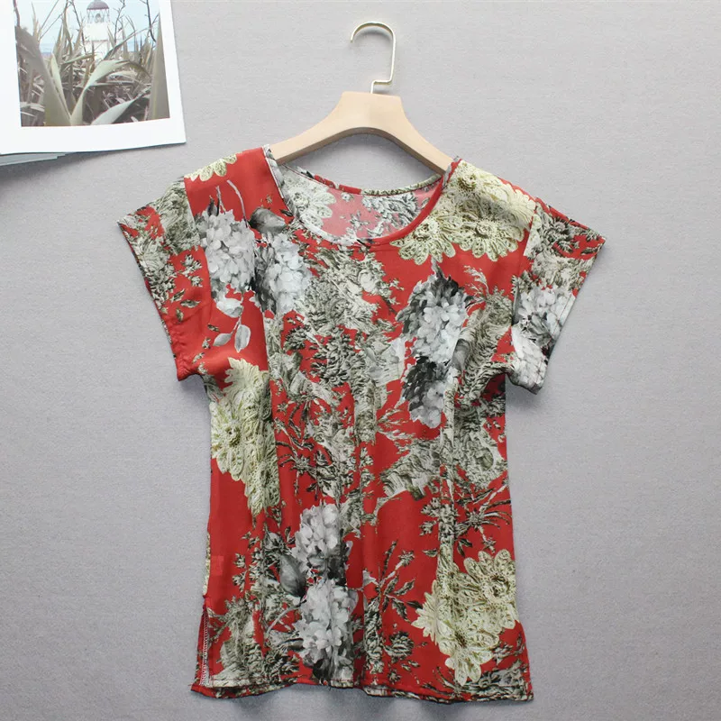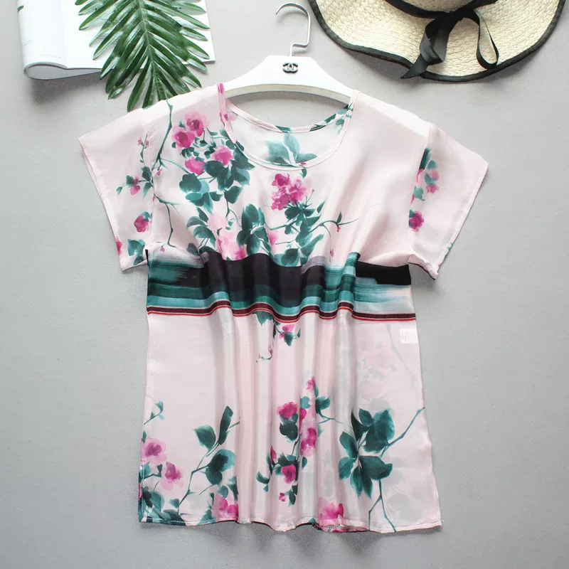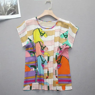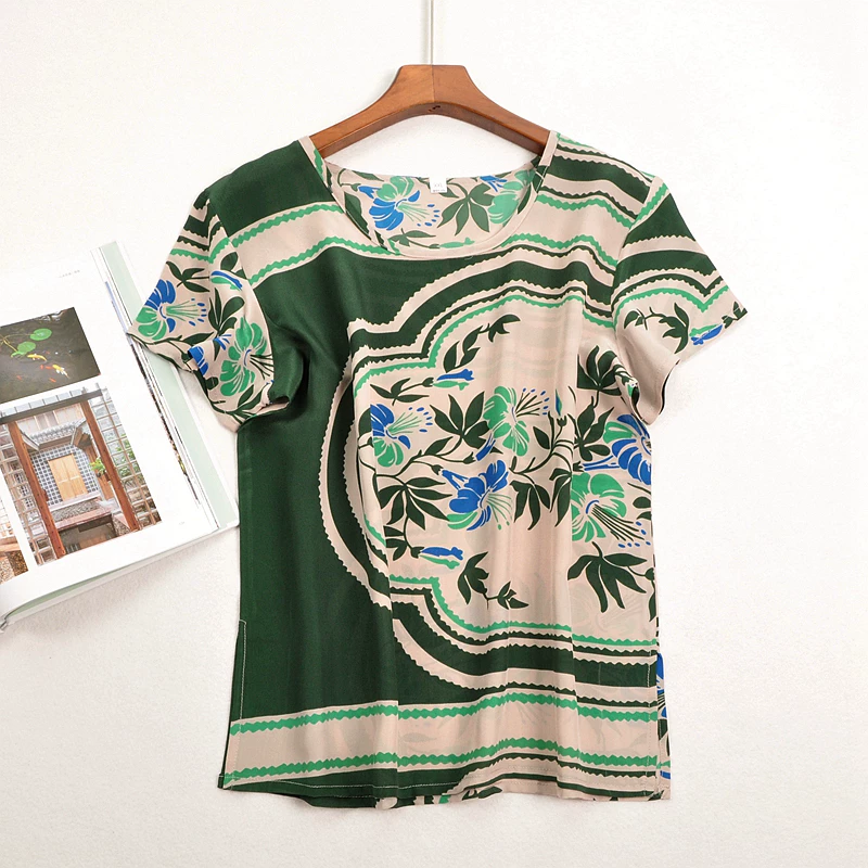 2021 Лето Новое поступление женский 100% шелк с коротким футболки с рукавами Круглый воротник шелковой футболкой со свободным низом-рубашка