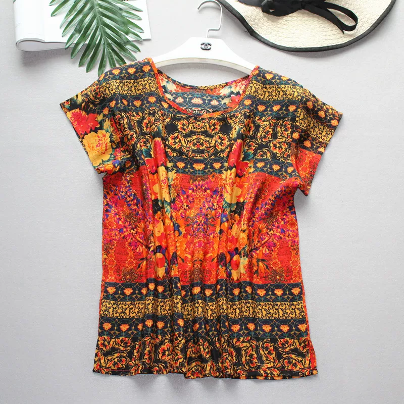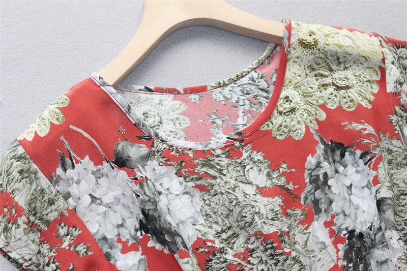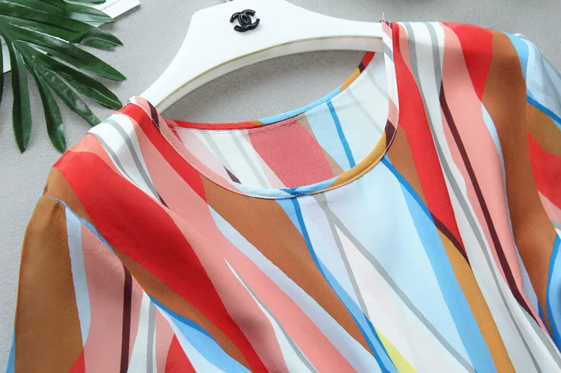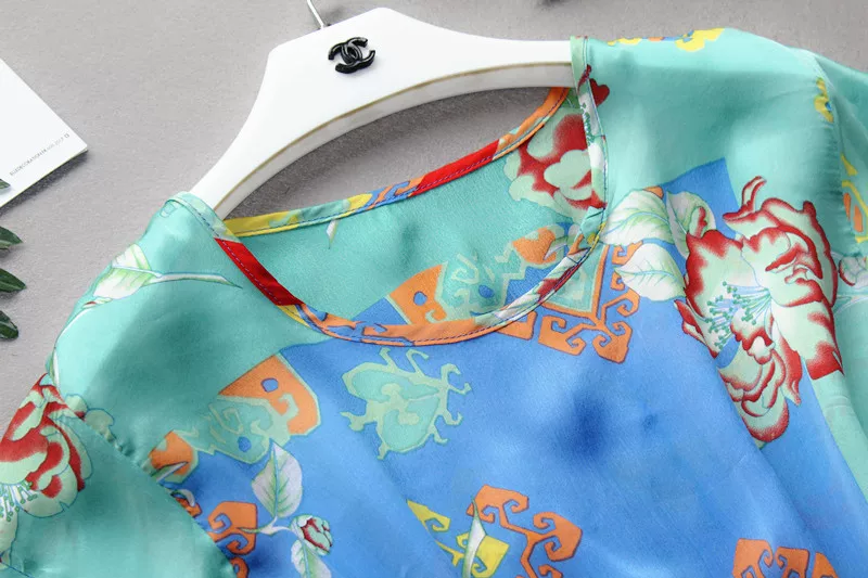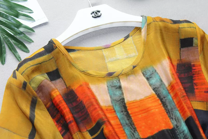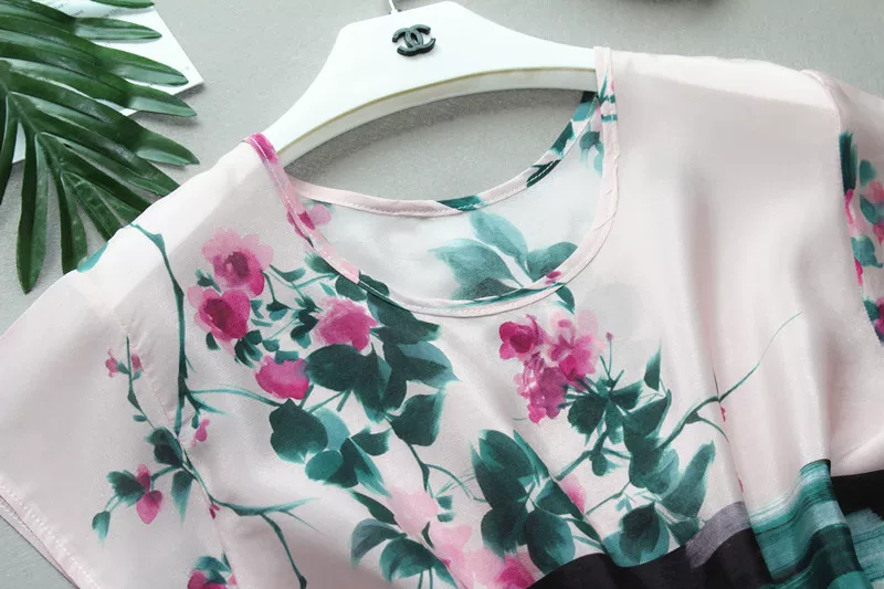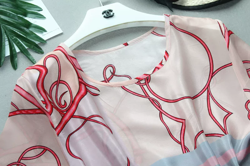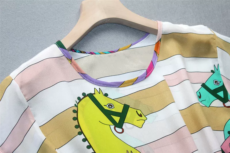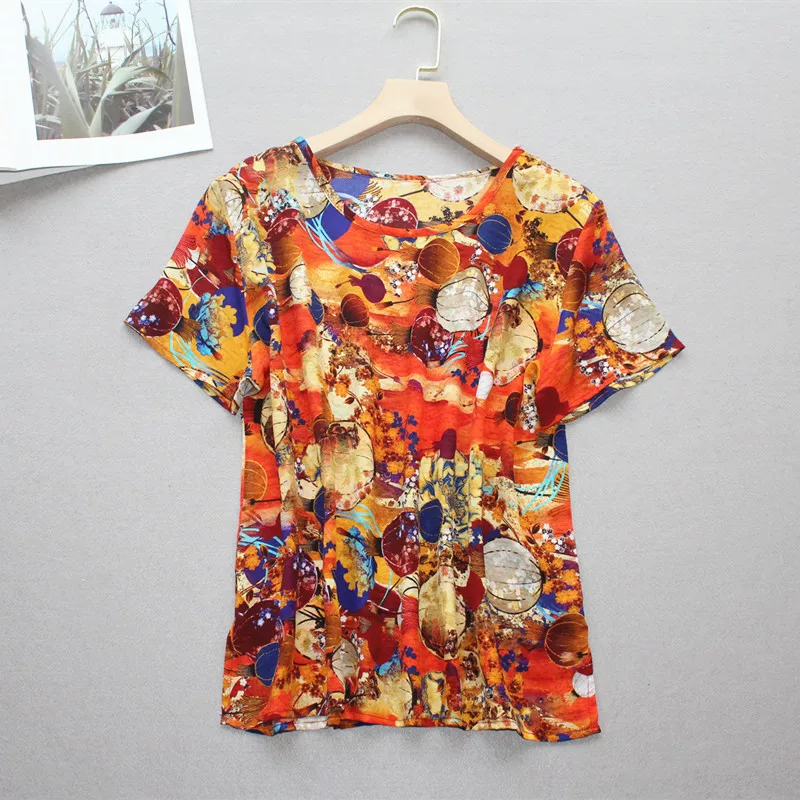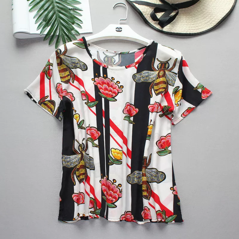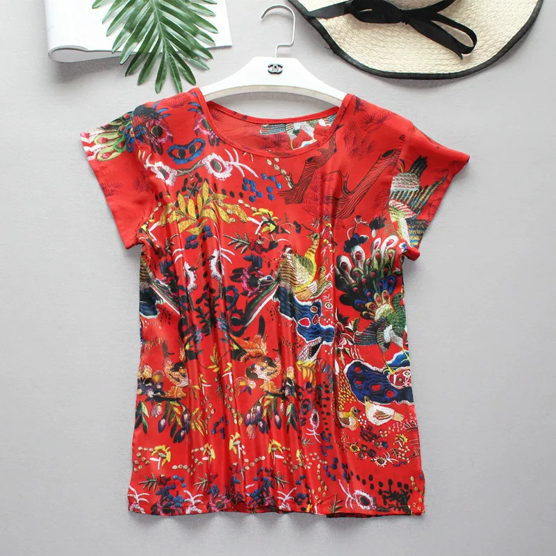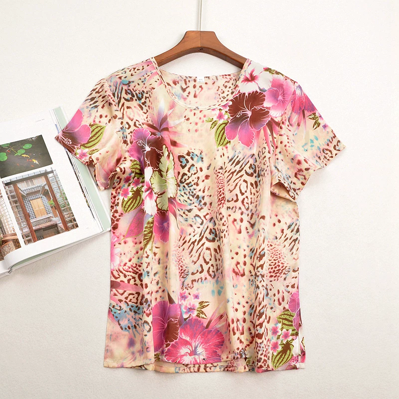 2021 Лето Новое поступление женский 100% шелк с коротким футболки с рукавами Круглый воротник шелковой футболкой со свободным низом-рубашка