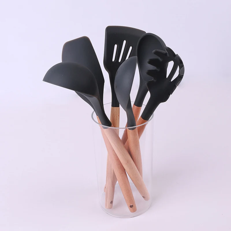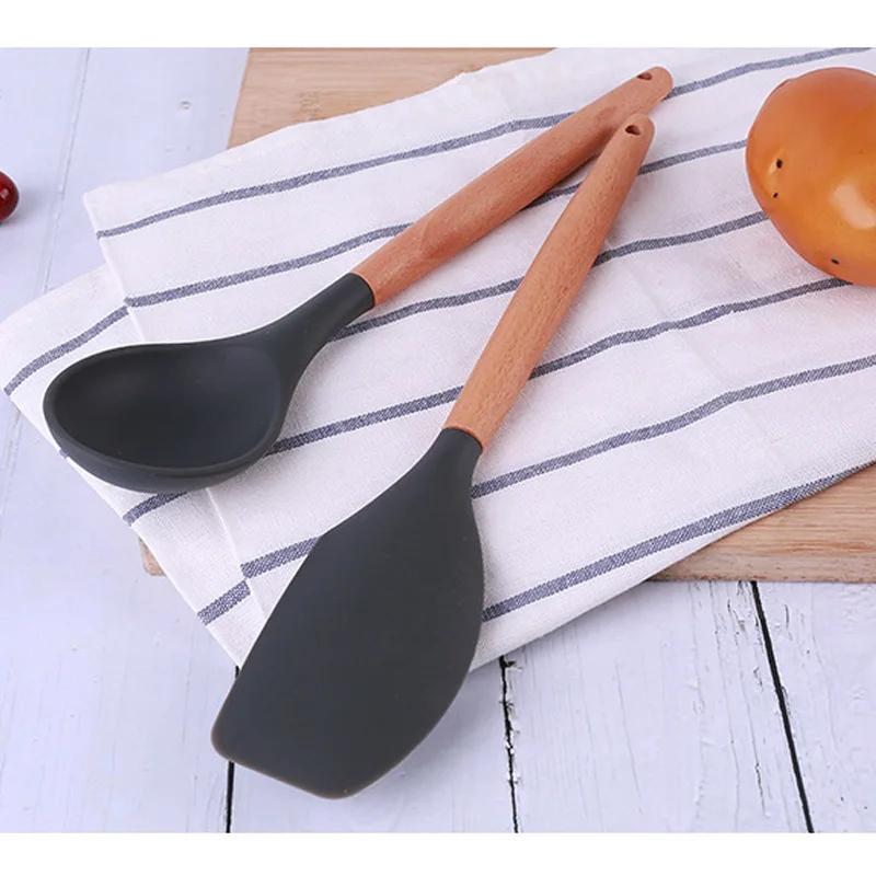 Силиконовые кухонные инструменты, наборы для приготовления пищи, ложка для супа, лопатка с антипригарным покрытием и деревянной ручкой, специальная термостойкая конструкция