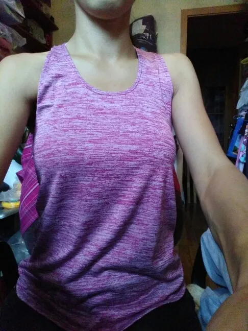 Майка - бомбическая бомба! То что доктор прописал на тренировки! Свой размер М, брала на размер больше, чтобы не было в обтяжку. И получилось так, как я хотела! Ткань легкая синтетика - идеально! Завтра проверим на тренировке, но знаю ,что она клевая!