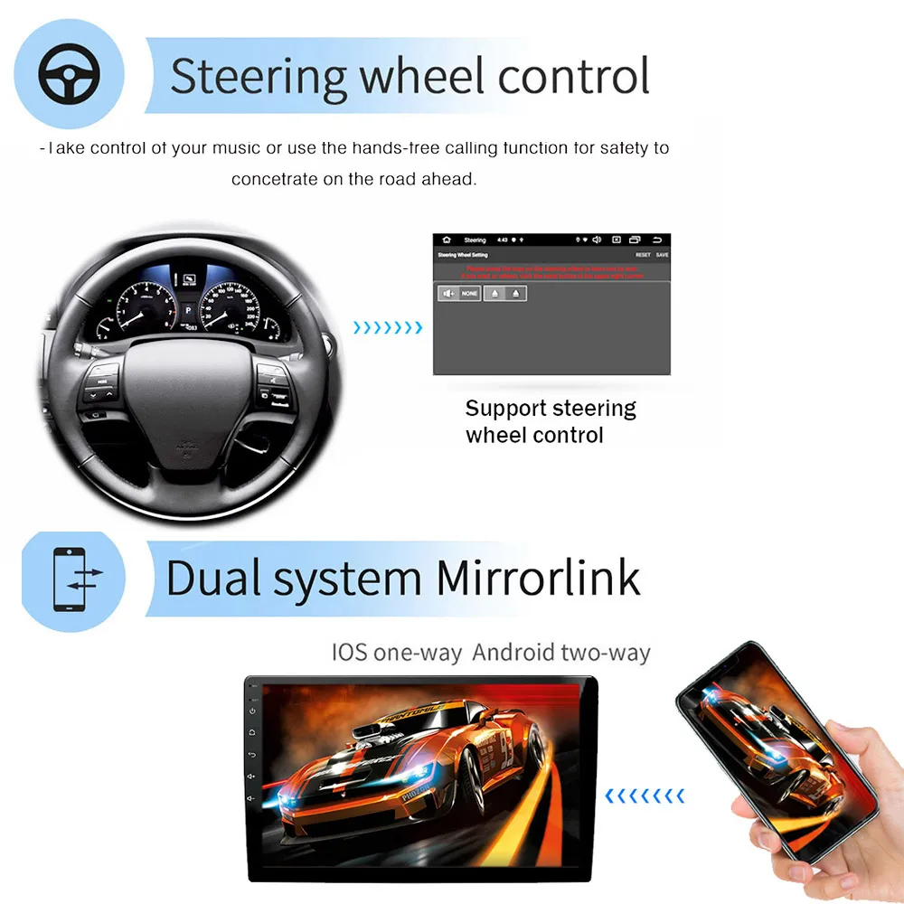 1. 10 дюймов/9 дюймов 1024*600 супер высокой четкости цифровой экран, полностью емкостный сенсорный экран управления2. Встроенный GPS, загрузите навигационное приложение, чтобы ваш автомобиль стал gps-навигатором.3. Встроенный Bluetooth 4,0, hands-free, телефонная книга, A2DP для парения музыки телефона на радио.4. Встроенный AM/FM/R.D.S с 30 предустановленными станциями5.Android 8.1 система, четырехъядерный процессорВстроенный 1G DDR3, 16G флэш-память6. Подключение к смартфону, зеркальная связь с двойным контролем7. Поддержка HD 1080P видео и музыки8. Регулятор громкости/фейдера/баланса/высоких частот/басовМножество настроек эквалайзера9. Поддержка управления рулевым колесом10. Поддержка камеры заднего вида11. Поддержка Микрофона12. 2CH задний видео вход13. 2CH задний RCA вход14. 2CH задний аудио выход15. Многоцветный кнопочный задний светильник