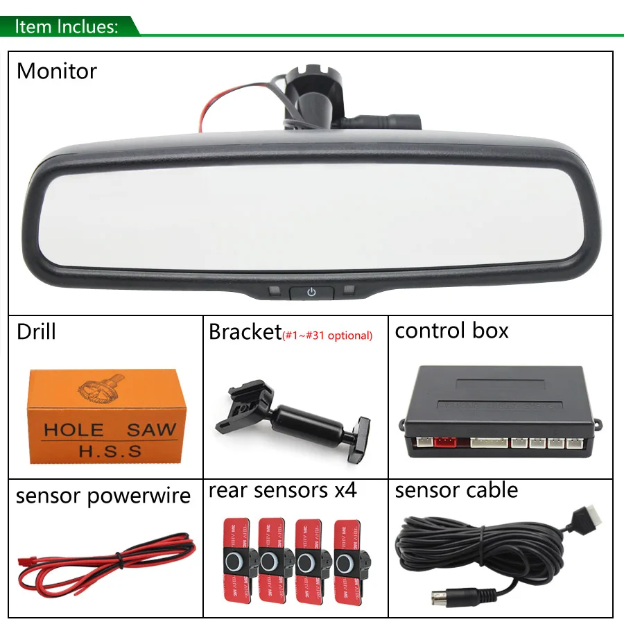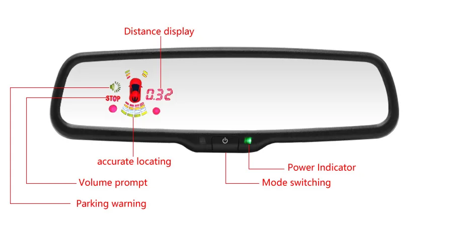 Характеристики: 1) с помощью датчика парковки, предназначенного для зеркала заднего вида автомобиля, автоматическая система сигнализации для парковки внутренних зеркал. 2) радар, установленный в задних бамперах, кабель питания, автомобильный Реверсивный источник питания, Реверсивный, система радара автоматически начинает работать. 3) использование и замена оригинального кронштейна для зеркала заднего вида, радар-датчик может распылить краску. Все более идеально. 4) от-30 до + 60 температурный диапазон применения, полностью соответствует применению автомобильной среды. Испытание на погружение в воду высокого давления и 12 часов на электрическое испытание на старение, многослойная водонепроницаемая конструкция.