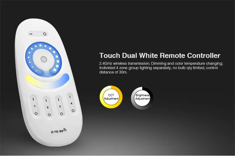 Название продукта: 2,4 ГГц 4 зоны RF пульт CCT Управление Номер модели: FUT007 Напряжение: 3 в (2 батареи не входят в комплект) Частота передачи: 2,4 ГГц Метод модуляции: GFSK Передающая Мощность: 6dBm Стандартное энергопотребление: 20uA Расстояние управления: 30 м Размер: 110*53*21,5 мм