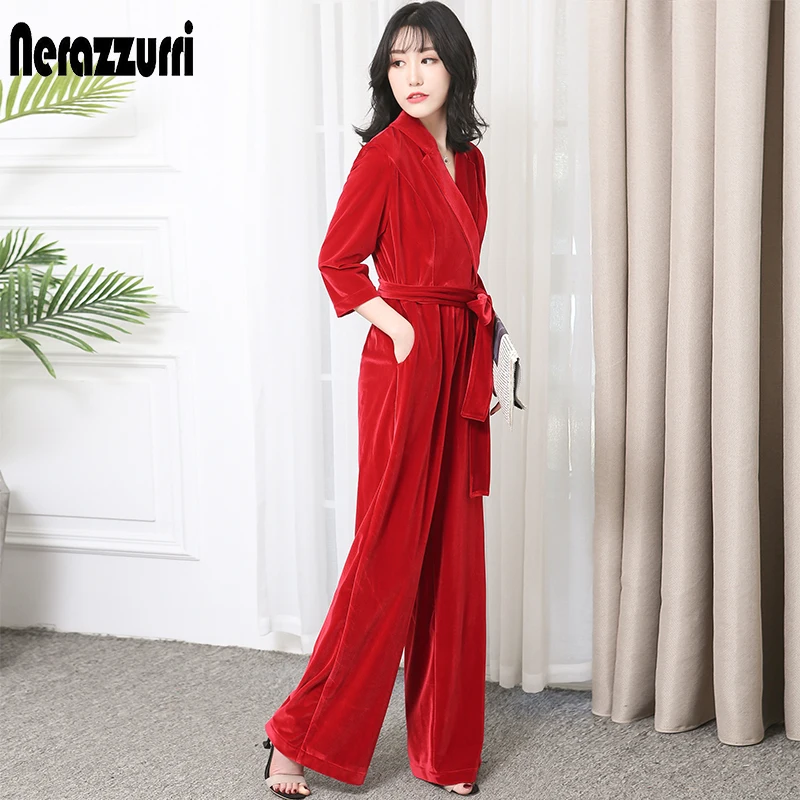 Nerazzurri Осенний длинный бархатный комбинезон с рукавами и поясом для женщин 2021 г. Макси Элегантный Красный Черный Широкие Ноги в пол в корейской моде