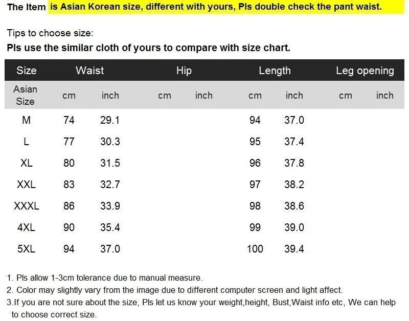 Данный товарАзиатский корейский размер, отличается от вашего, пожалуйста, дважды проверьте обхват талии брюк.