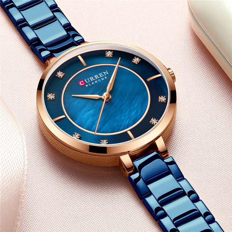 Женские наручные кварцевые часы CURREN, золотистые и синие часы с классическим браслетом из нержавеющей стали, 9051