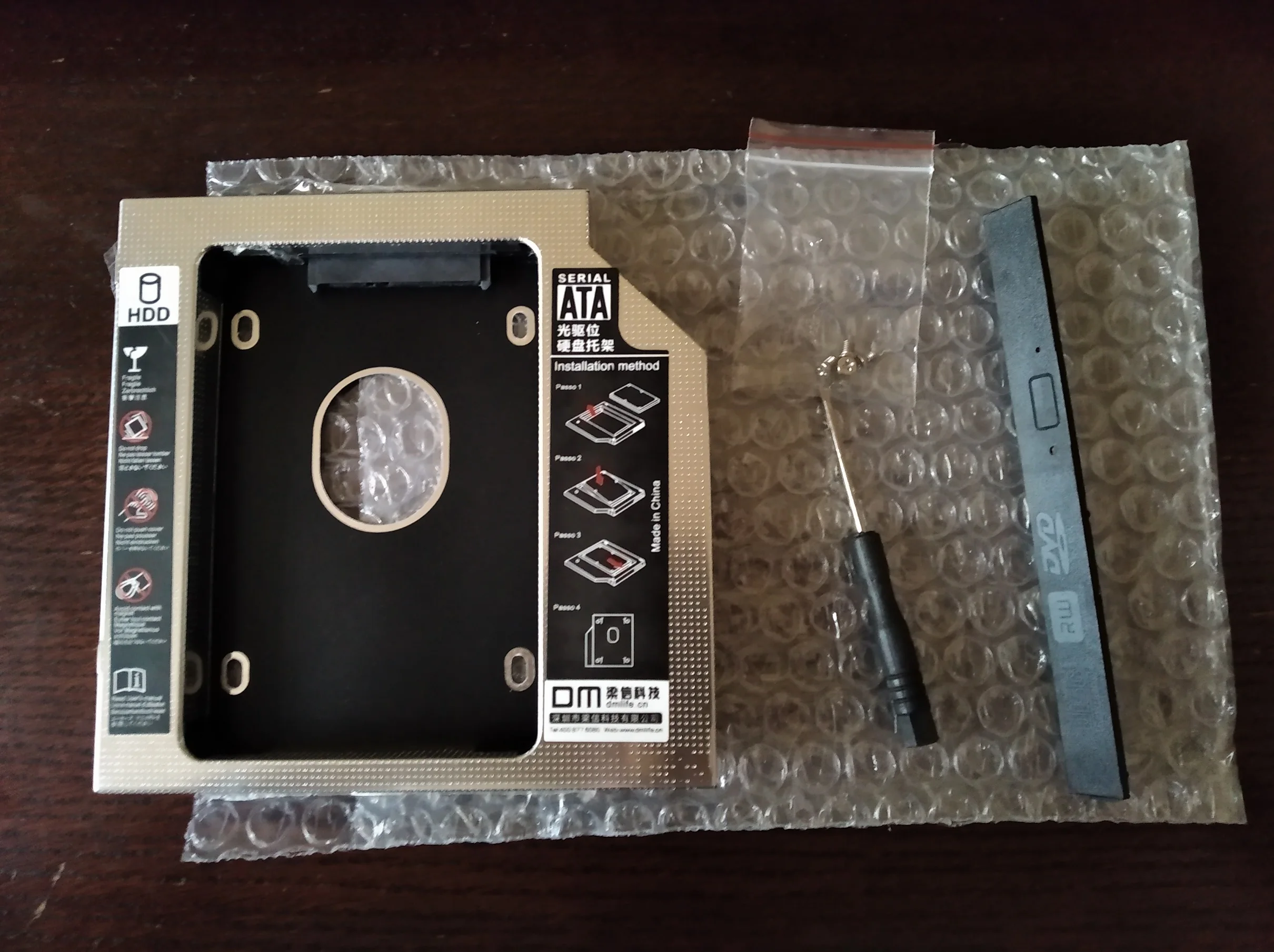 Посылка пришла в пупырке, целая. В комплекте шли 4 болта и отвертка. Заглушка от DVD-привода встала без проблем. Только вот мой HDD в этом переходнике работать отказывается, так как ему не хватает питания (разъем IDE не может дать достаточный ток для HDD). На такой случай в переходниках есть специальные переключатели, но здесь его нет (к продавцу претензий нет, это я виноват, не досмотрел). А SSD в нём работает без проблем. Вообщем, товар и продавца рекомендую.