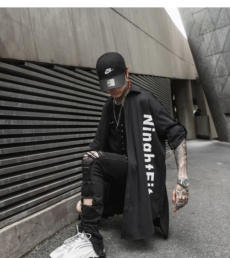 Мужская Тонкая рубашка в стиле панк, темно-синяя рубашка с длинным рукавом и принтом букв, уличная одежда, осень 2019