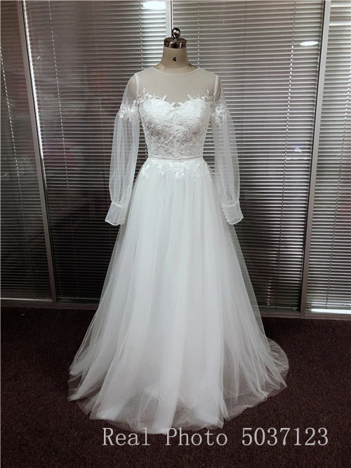 Кружевное свадебное платье с вырезом, длинными рукавами-фонариками и аппликацией