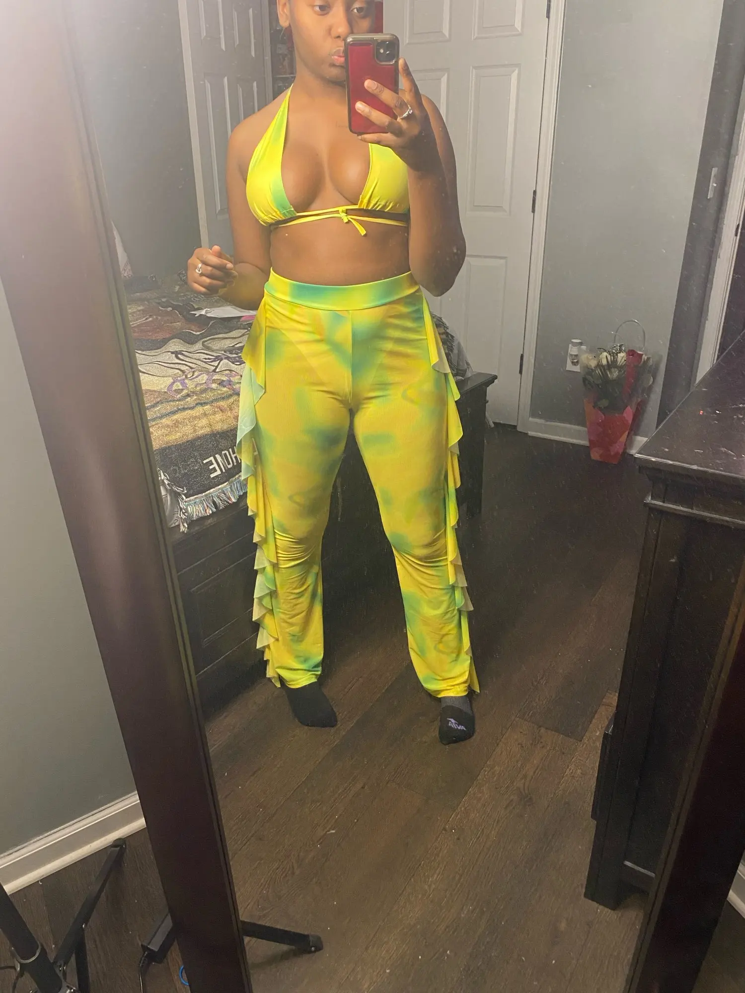 Плохое качество, поддержка-это кусок прозрачной ткани, слишком маленький для большой груди, он ничего не держит, брюки хороши в целом, но размер немного великоват