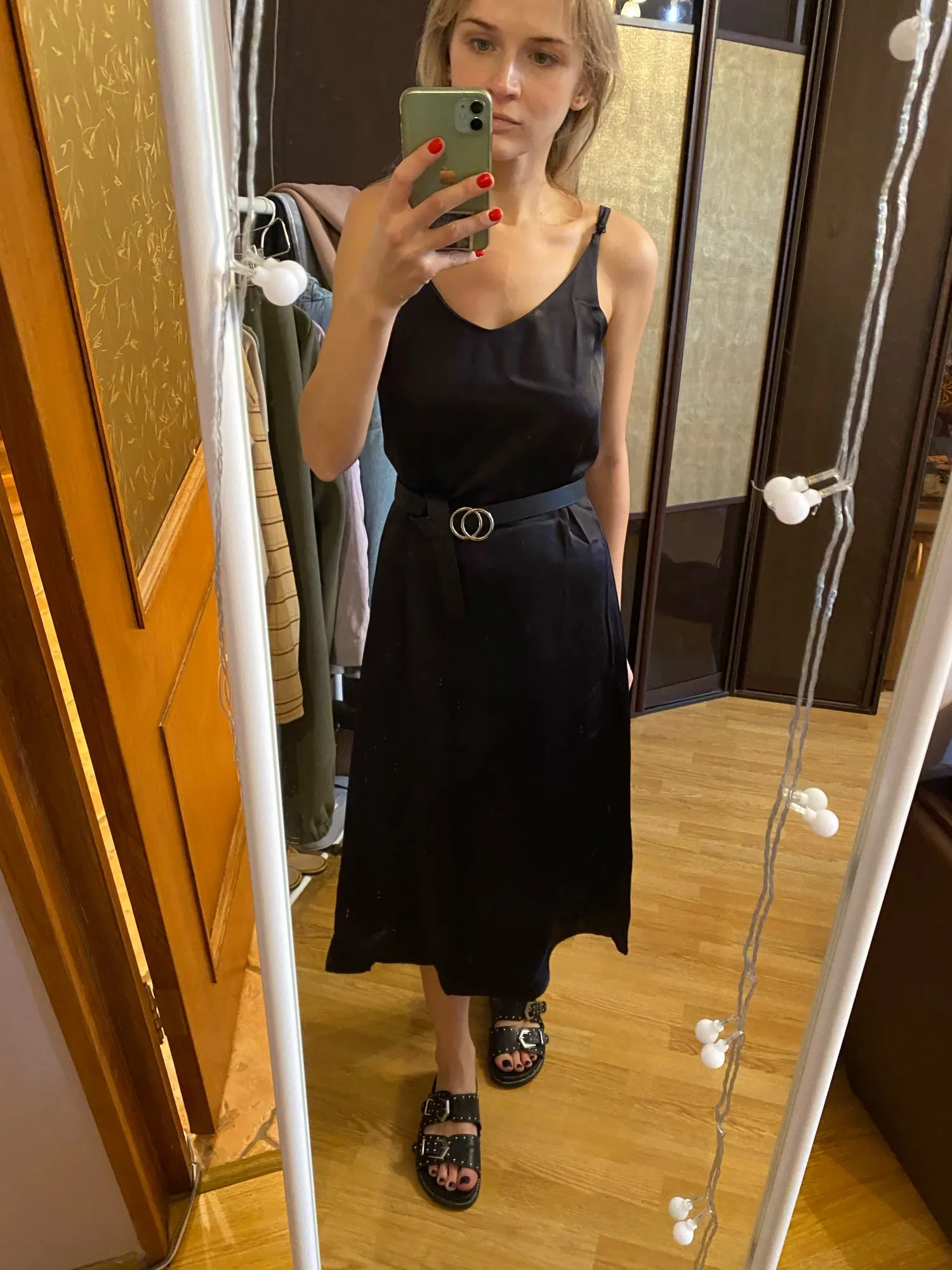 Нереально приятное и крутое платье. Только носить его мне исключительно с ремнем. Ибо s немного не s на мне. Длина до середины голени. Цвет нереально крутой
