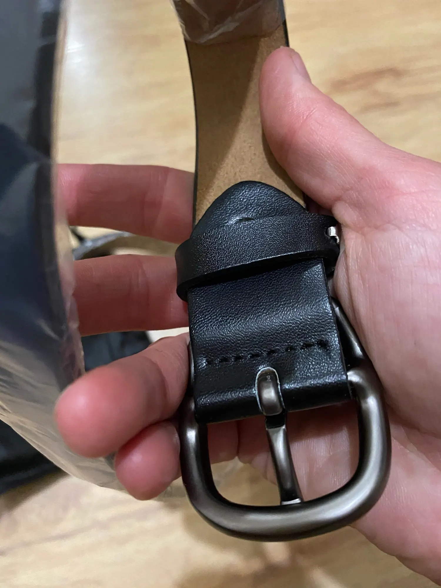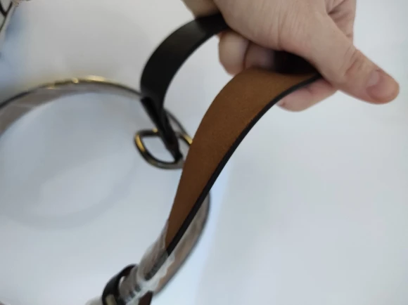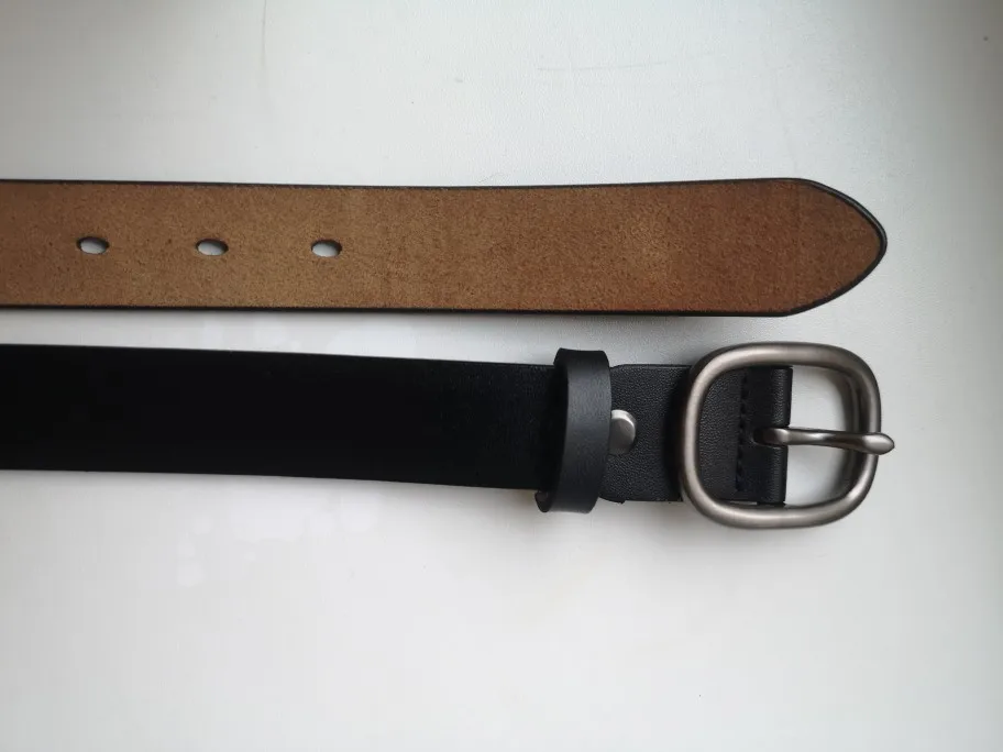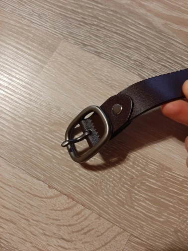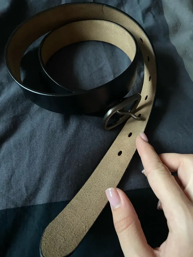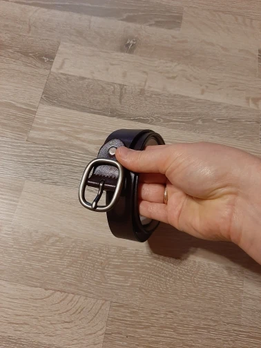 Я очень сильно сомневаюсь, что это натуральная кожа. Т.к в разрезе видно, что ремень склеен из двух частей. Да и не пахнет он кожей , от слова совсем. Очень большая надежда, что в эксплуатации он будет прочным и прослужит не 1-2 месяца. У ремня довольно внушительная и на вид прочная пряжка, из-за чего ремень выглядит очень даже. На талию 69 см брала 90 см. В застегнутом состоянии остается еще 5 дырочек.