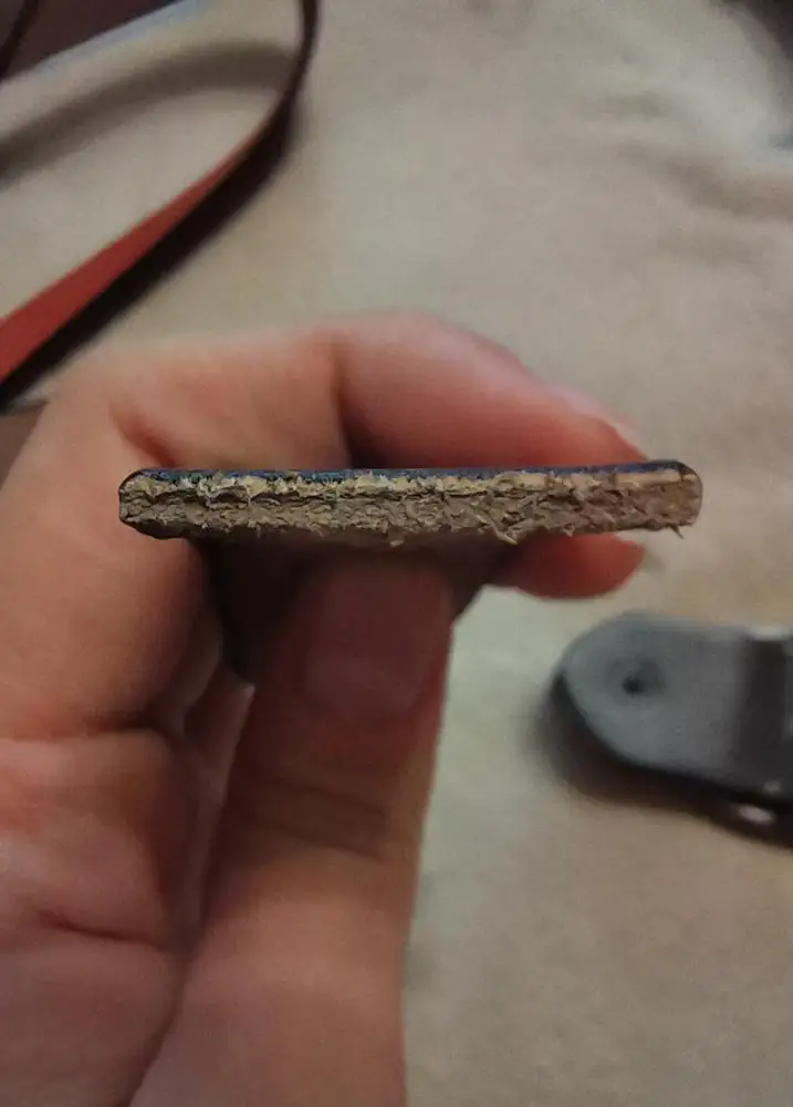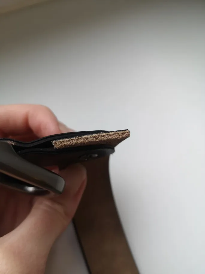 Это не кожа в классическом понимании. На срезе видно 3 слоя, внутренний слой - замша, остальные отличаются по цвету. На всей длине кромки ремня обработаны, и слои не видно, по большому счету - пофиг на то, из чего он сделан, главное, чтобы не расклеился.