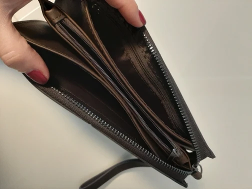 Доставка очень быстрая. Качество материалов и пошива высокое. Вместительный и очен удобный. Но дизайн кошелька неоднозначен: для женщин - не изящный и грубый, для мужчин - не мужской фасон.