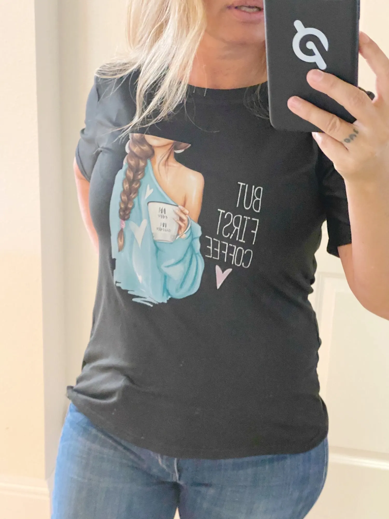 Женская Черная Футболка BUT FIRST COFFEE, Новое поступление, Забавные футболки, женская уличная одежда, футболка из полиэстера, популярная женская одежда