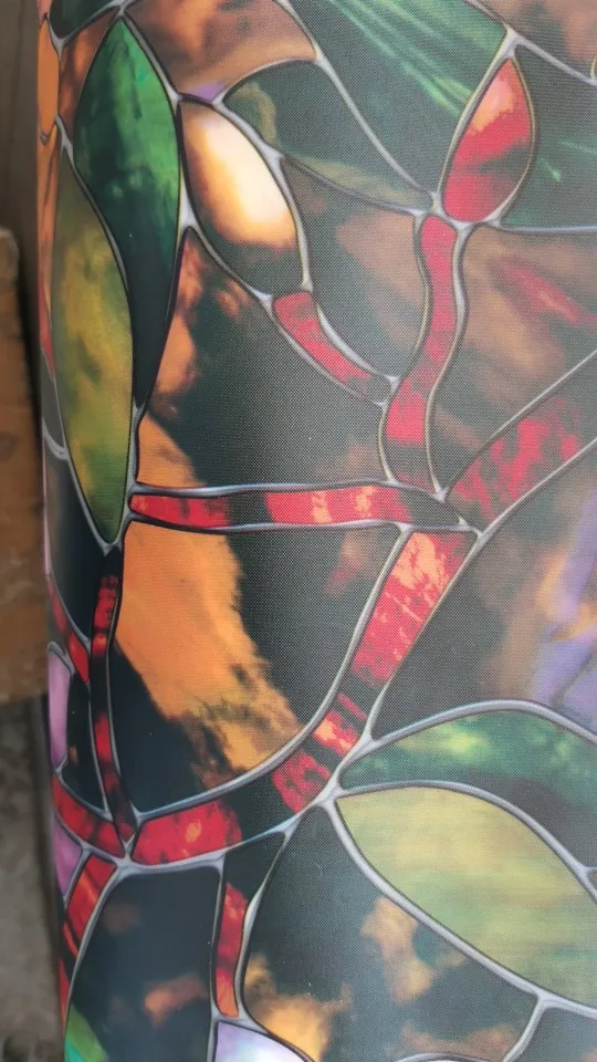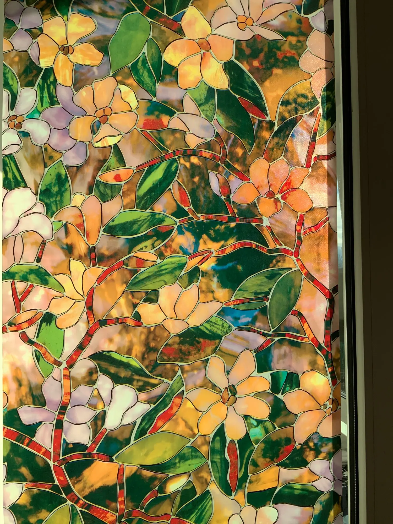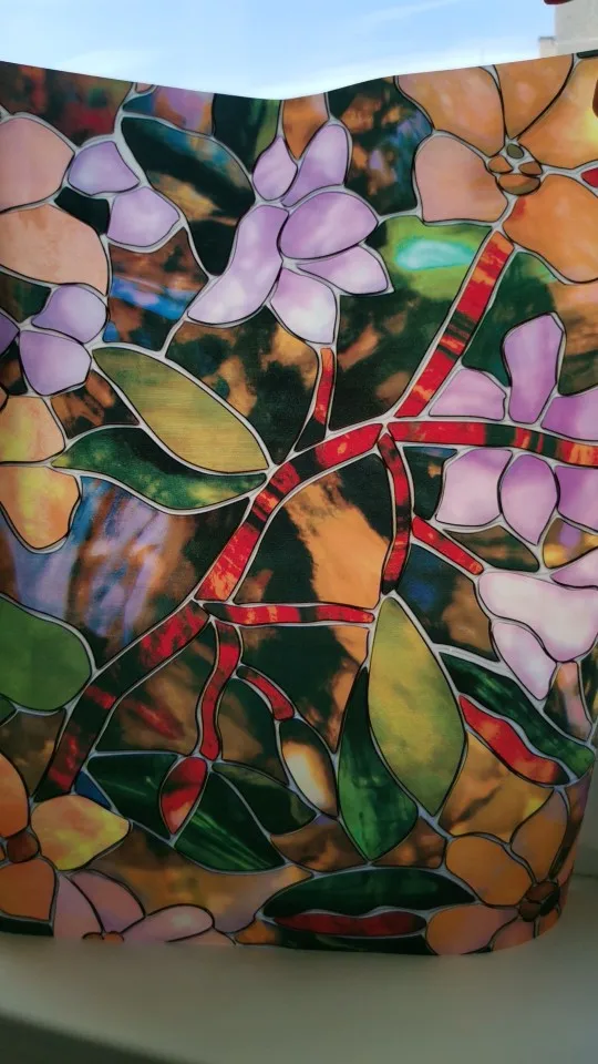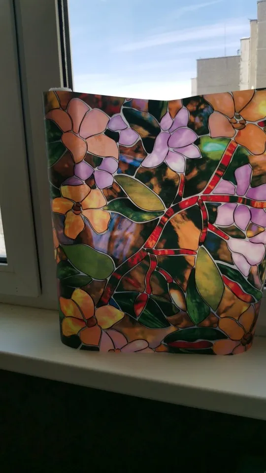Хорошая качественная плёнка, светопроницаемая, так что эффект витража будет, поверхность шершавая, бликовать не будет, намотана на мягкий цилиндр, дошла в целости