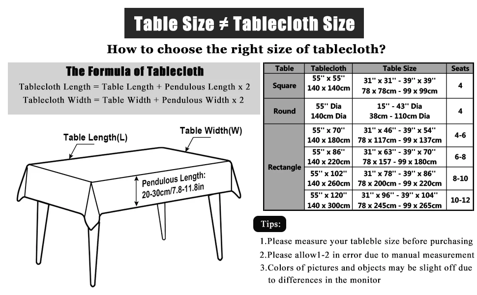 Как выбрать размер скатерти: (REctangle)A. Измерьте ширину и длину таблицы;B. Ширина стола + 25/30 см x 2 = скатерть ширина Длина стола + 25/30 см x 2 = скатерть длина