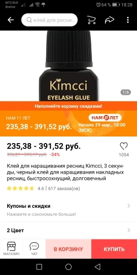 Заказала впервые. Сразу отмечу, этот клей не жжёт глаза, жидкая консистенция позволяет экономно его расходовать, на ресничном кластере при обмакивании остаётся чуть клея, что позволяет аккуратно прикрепить в подресничное пространство. Сколько будет носиться не знаю. Сегодня себе сделала ресницы, позже отпишусь о времени носки.