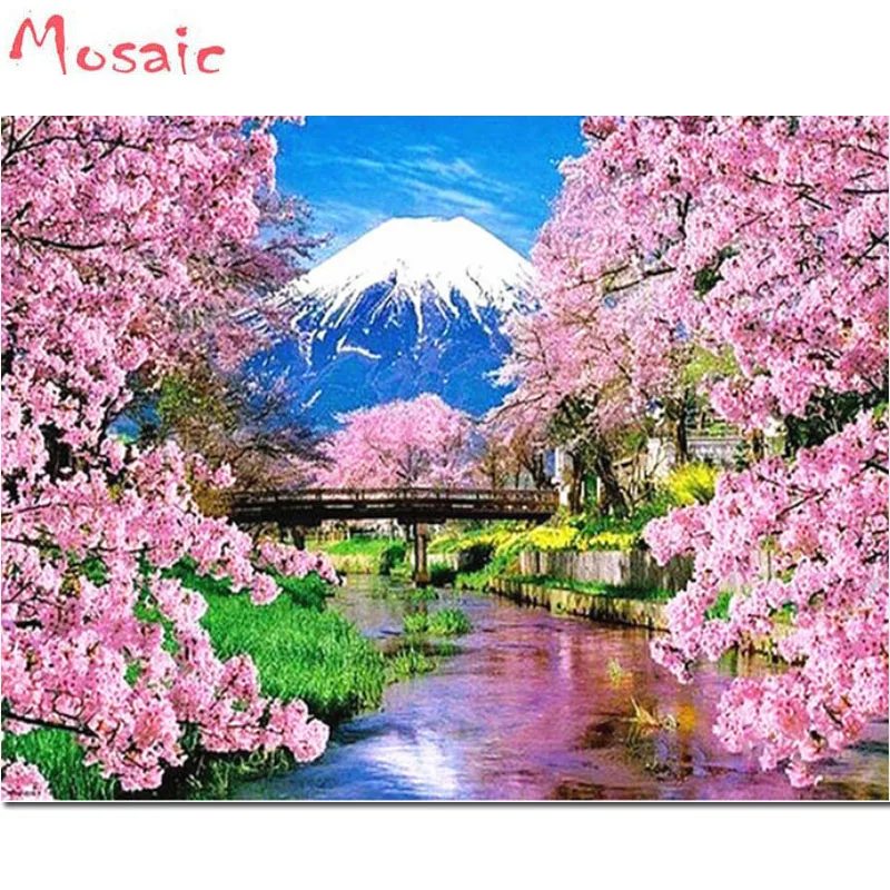 Алмазная 5D картина Цветы и горы, картина с полными квадратнымикруглыми стразами сделай сам, Сакура, крепление Fuji, 3D вышивка крестиком, 5D декор, подарок