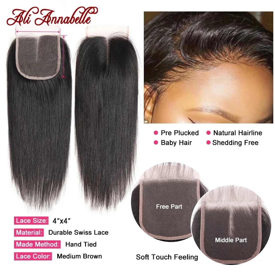 Пряпряди волос ALI ANNABELLE с кружевной застежкой 4x4, предварительно выщипанные прямые малазийские прямые человеческие волосы с застежкой