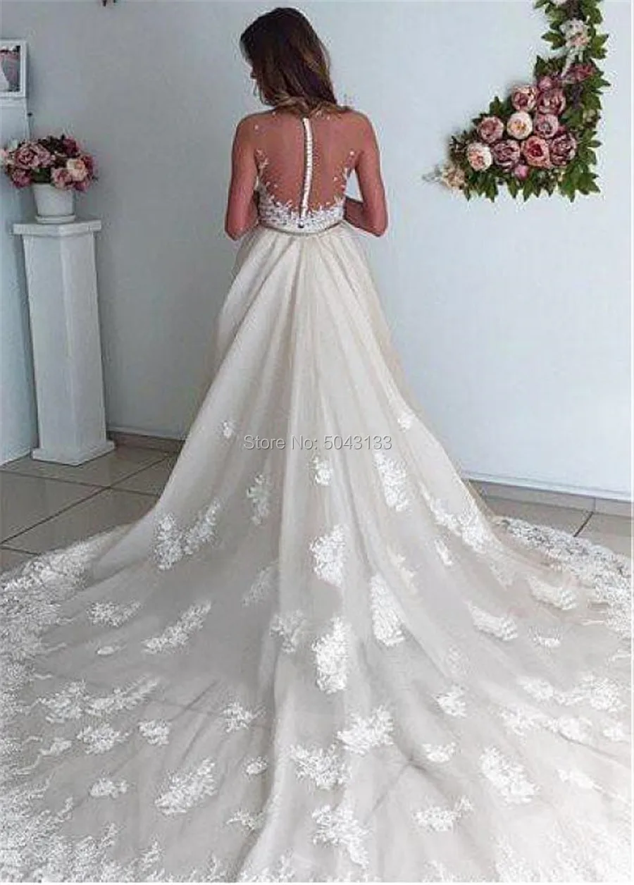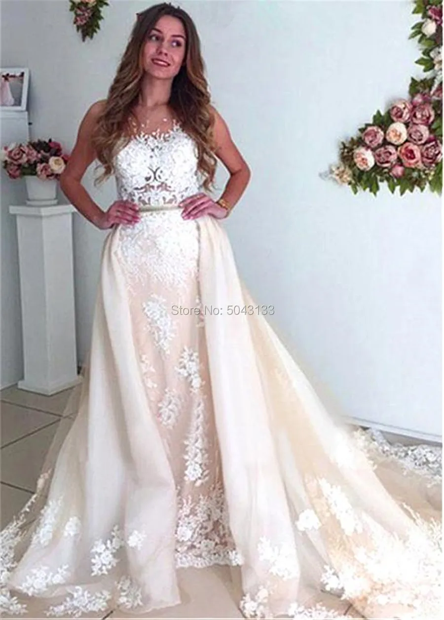 Соблазнительное свадебное платье-Русалка из двух частей с драгоценным вырезом, кружевное платье с аппликацией и бисером со съемной юбкой, свадебное платье