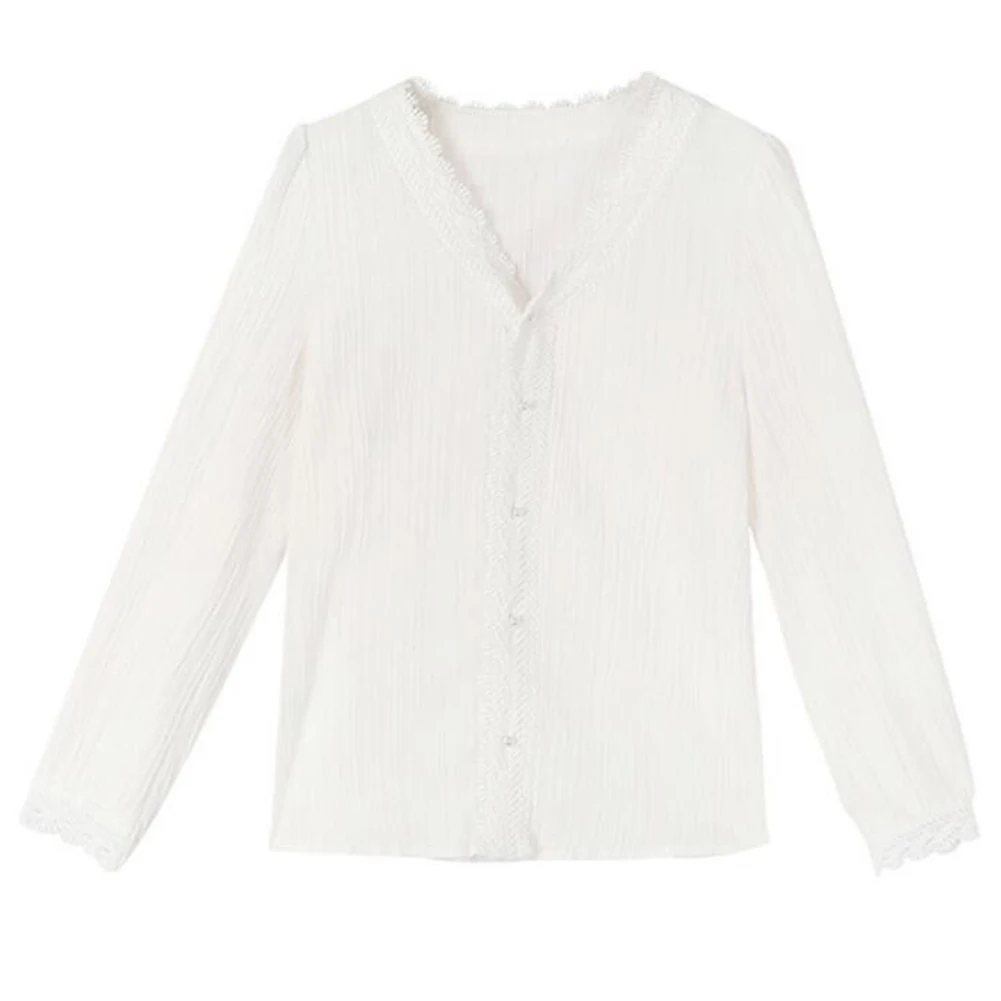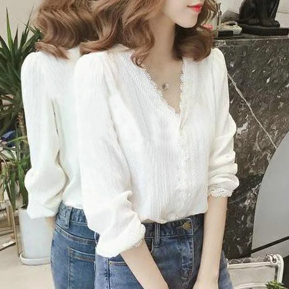 Блузка женская, белая, с длинным рукавом, с V-образным вырезом, на пуговицах, повседневная, 2019