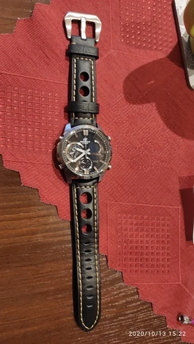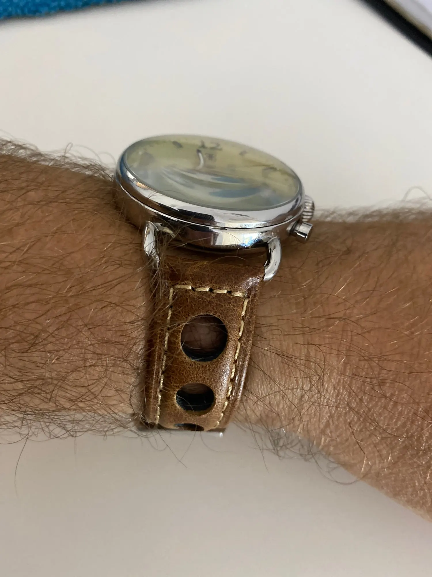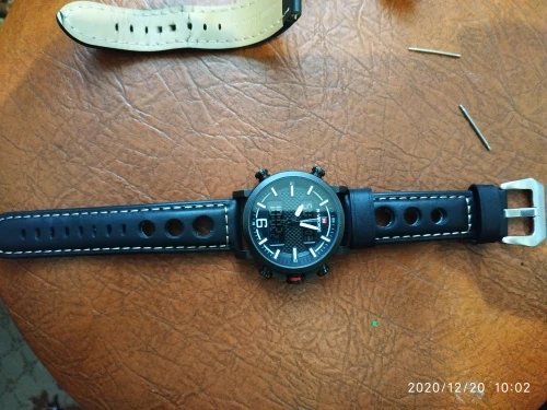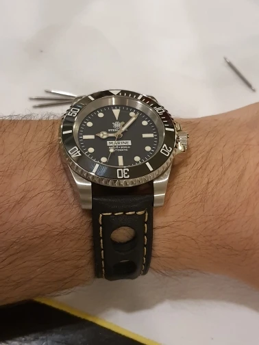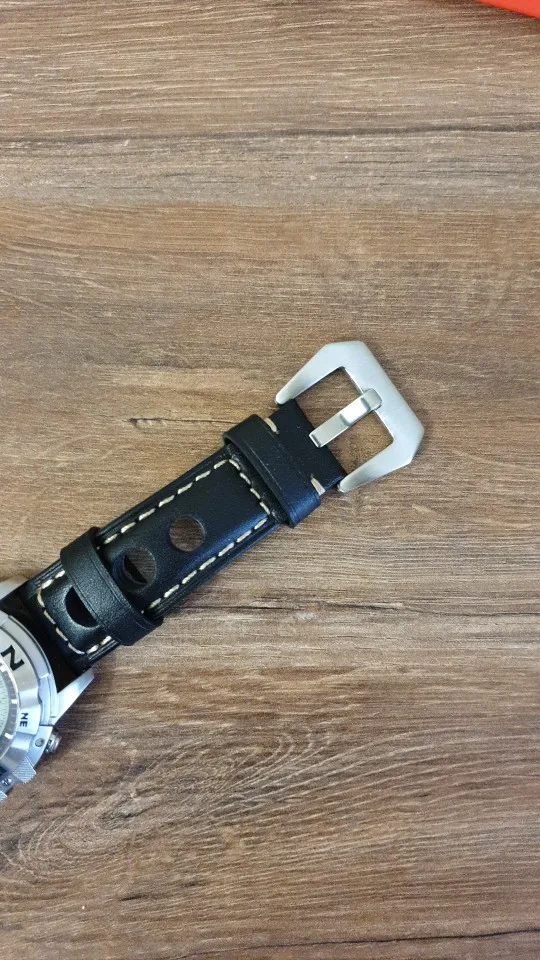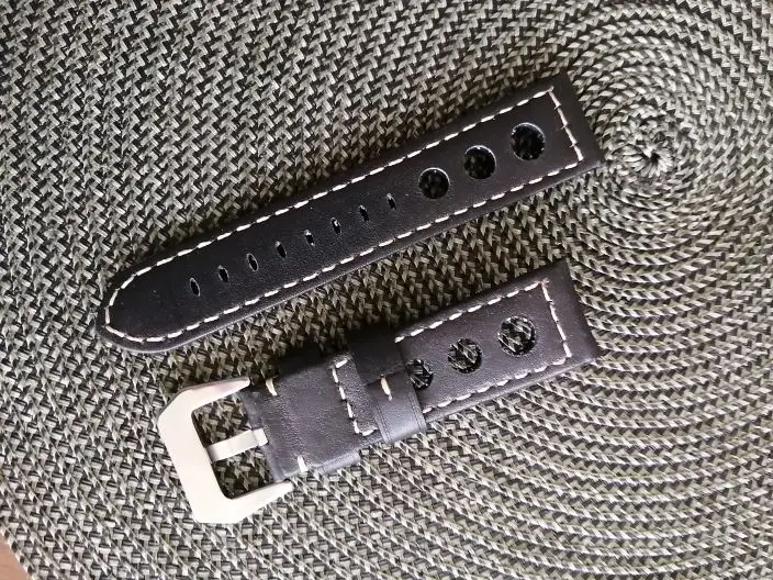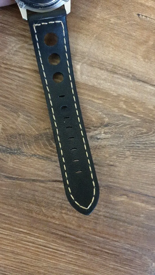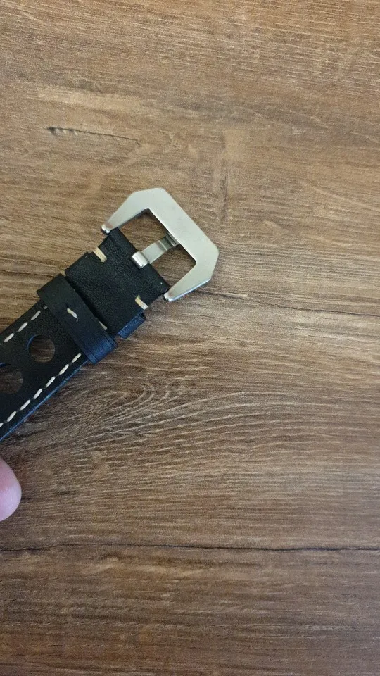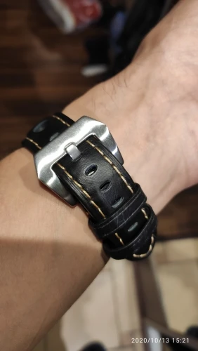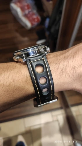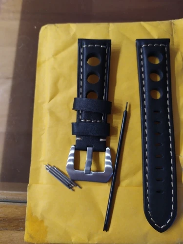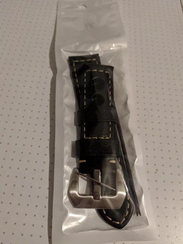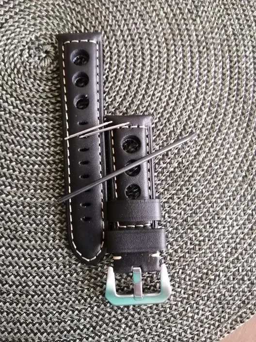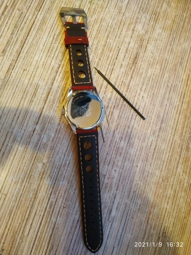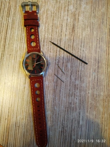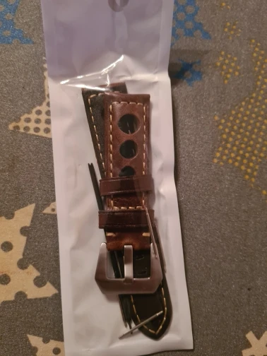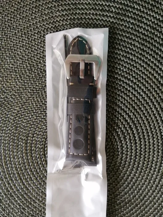 Ремешок пришёл менее чем за месяц, с характерным запахом китайских складов, цвет немного отличается от тех что на фото, и это не кожа. Из плюсов - качественно сделан, и инструмент что идёт в комплекте очень пригодился, пряжки ставил свои, после обработки средствами для кожи стал приятно пахнуть. На руке смотрится не плохо.