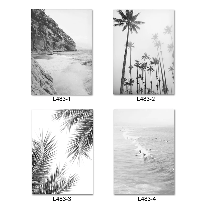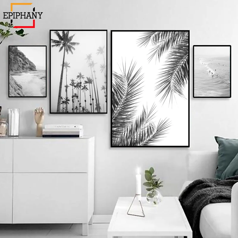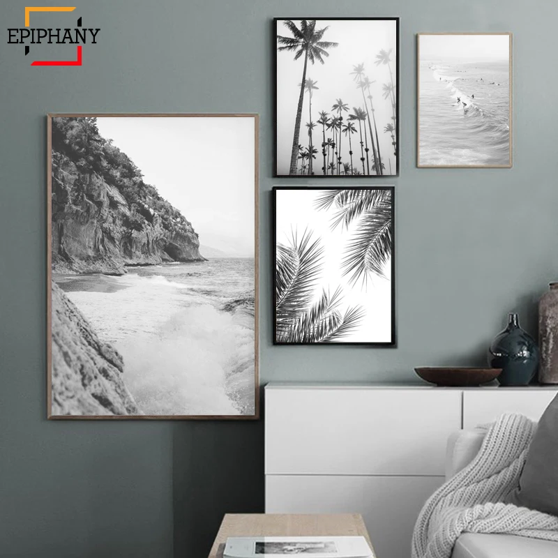 Современные картины, пляжные художественные принты, Пальмовые Листья, холст, картины, черный и белый морской пейзаж, постер, Настенная картина для гостиной