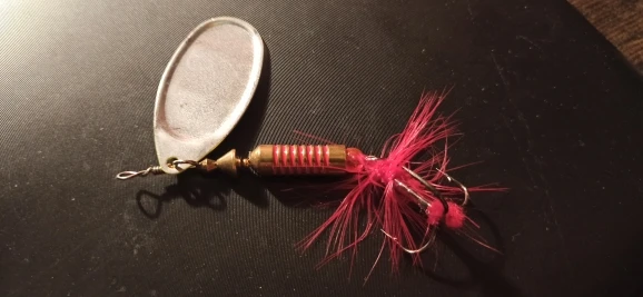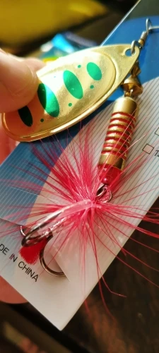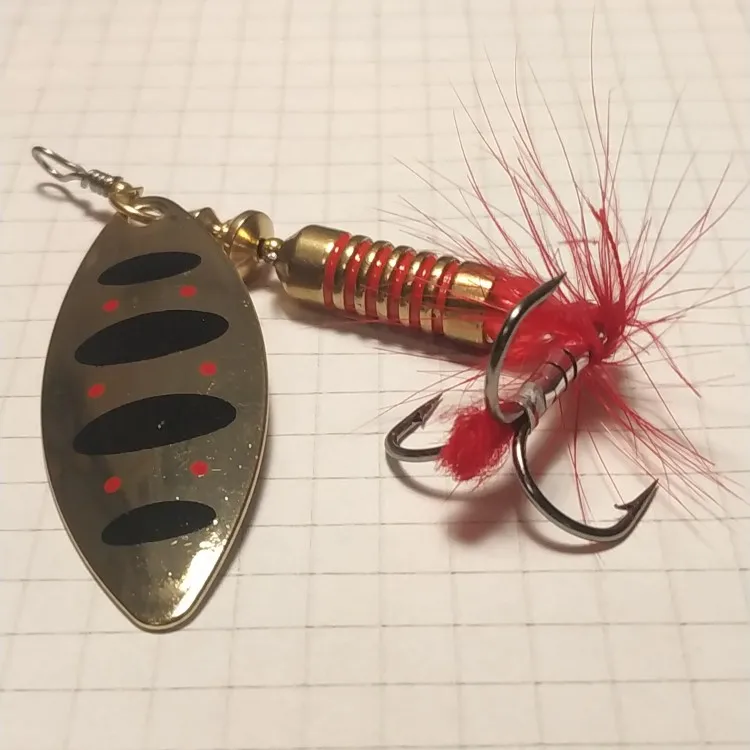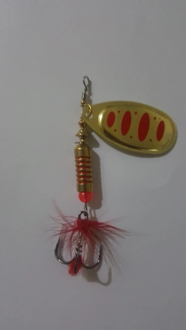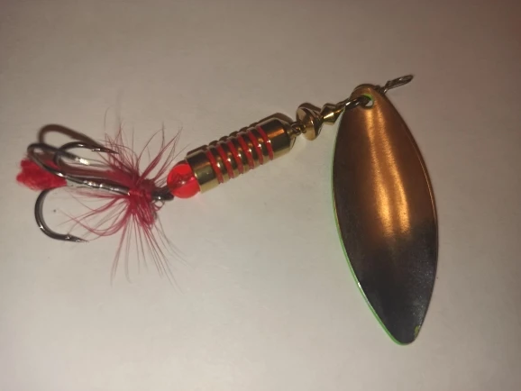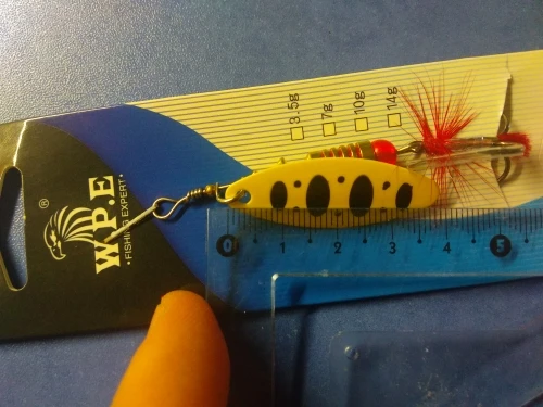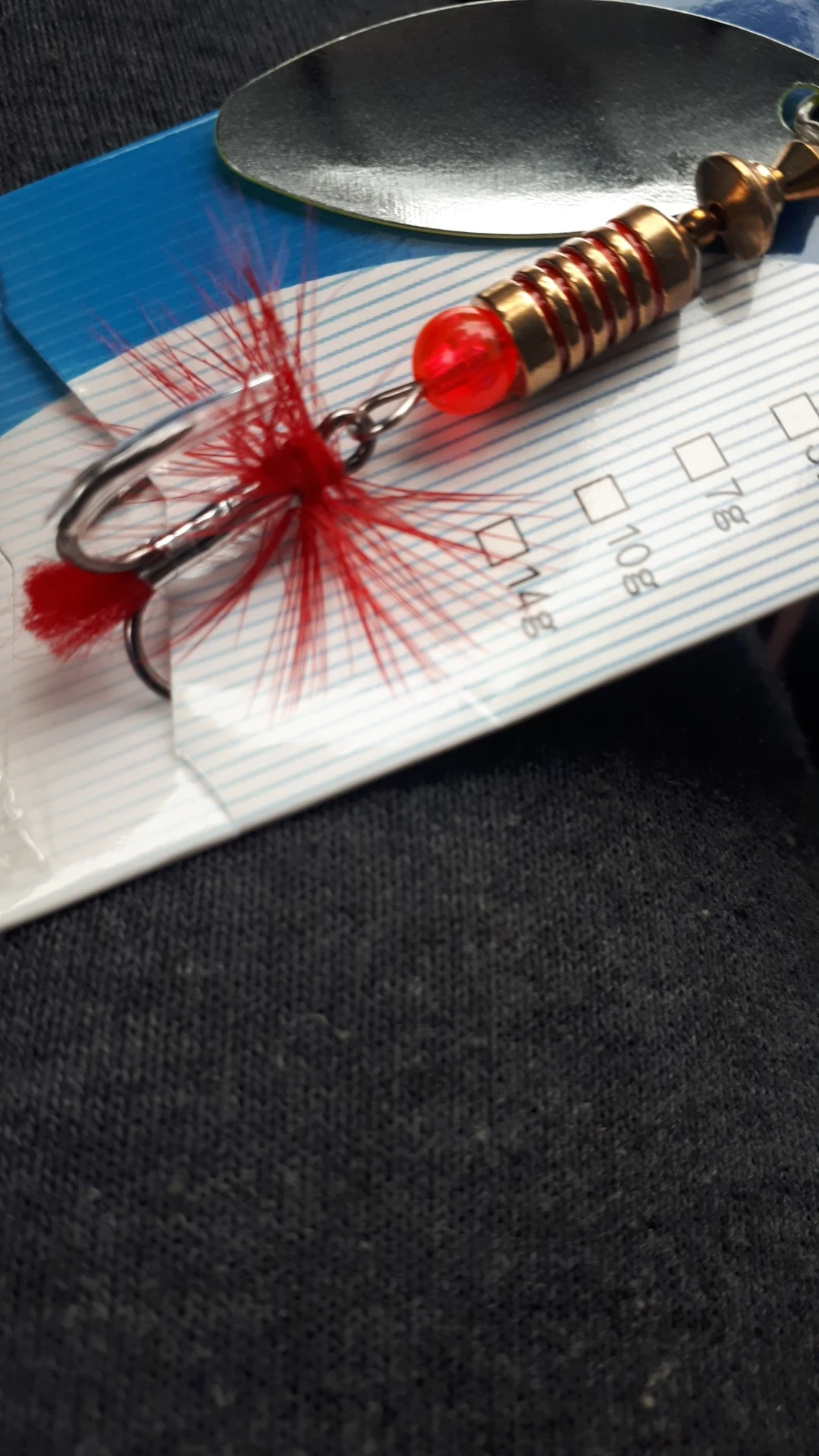 пришёл с поломанным тройником, блесна крупная, оперение не плохое, расстроил тройник.