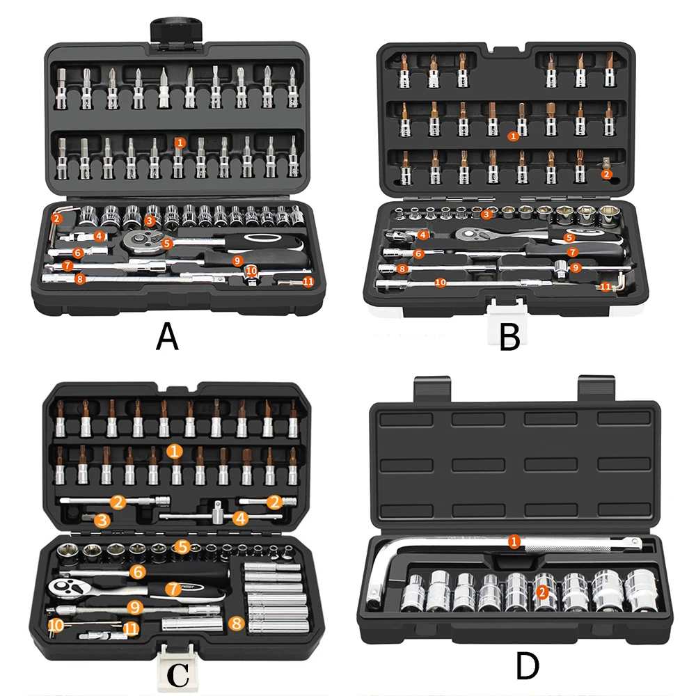 Отвертка: одно слово 4, 5,5, 7 м слово 1,2,3 крест 1,2,3 шестигранник 3,4,5,6,7,8 мм узор T10,15,20,25,30,35 ,40 Рукав 1/4: 4,4, 5,5, 5,5, 6,7,8,9,10,11,12,13,14 мм Гаечный ключ с храповым механизмом 1/4 Укороченный стержень + длинный стержень + эластичный стержень 1/4 квадратная ручка Слайдер 1/4 Шестигранный ключ 1, 2, 2,5 мм Универсальный шарнир Длинный рукав 6,7,8,10,11,12,13,14 мм -Этот товар изготовлен из высококачественного материала для прочного и практичного использования. Обладая высоким качеством и точным дизайном, он обеспечит его популярность и практичность. Этот товар удовлетворит все ваши потребности. Идеальный аксессуар для вас. -Используется для затяжки или ослабления, подходит для большинства болтов, гаек, винтов при обслуживании автомобилей, механиков, мотоциклов и так далее. -Храповой ключ может регулировать положительное и отрицательное направление, удлинитель добавляет длины, а универсальный шарнир обеспечивает лучший угол в ограниченном пространстве. -Изготовлен из сплава закаленной обработанной хромованадиевой стали, обладает высокой прочностью, устойчивостью к истиранию и устойчивостью к коррозии. -Многофункциональный и широкий набор инструментов идеально подходит для домашних проектов «сделай сам».